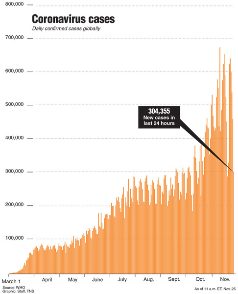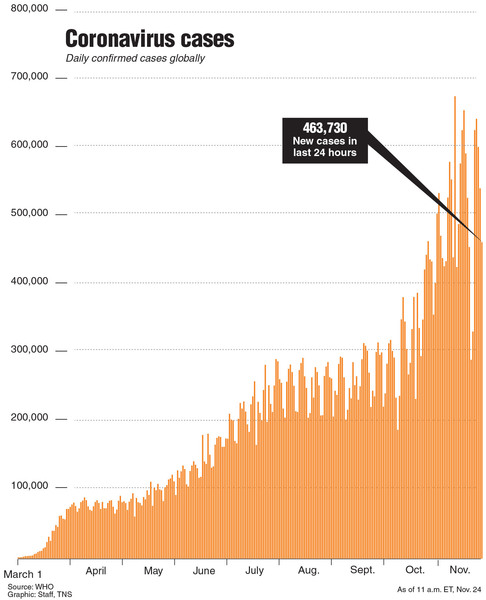 The 10 days with the most reported cases, both in the U.S. and worldwide, have all come in November.