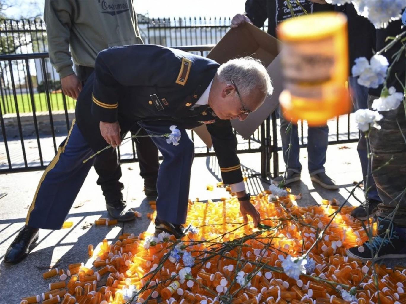 Dozens of US servicemen and women marched to the White House this Veterans Day and dumped a large box of empty pill containers, calling on the president and other federal officials to make medical marijuana accessible to veterans.