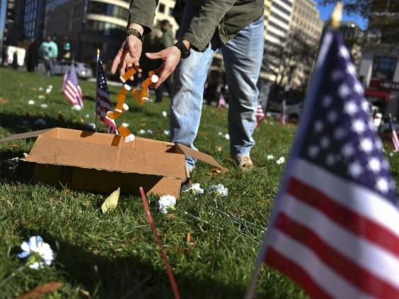 Twenty-two small American flags were planted in the ground at the front of the park, each representing a veteran to illustrate the oft-cited statistic that 22 veterans kill themselves each day. Each flag was adorned at its base with empty pill bottles and glow sticks meant to signify syringes.