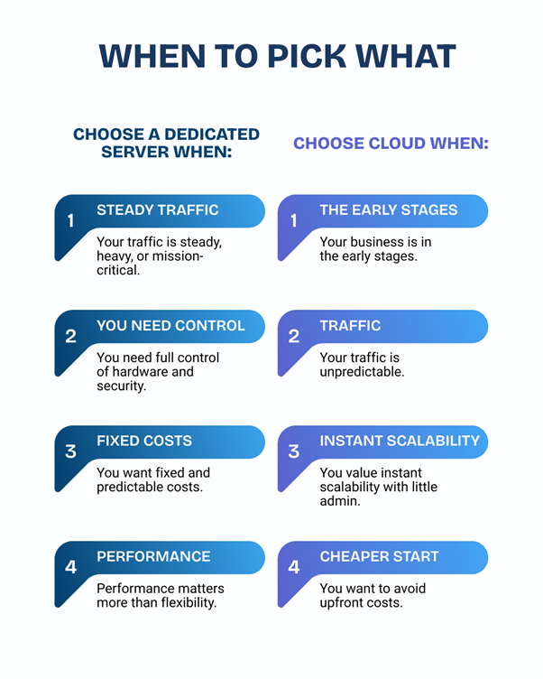 If you’re just starting, budgets matter. Cloud plans often begin much cheaper than dedicated servers. You can scale up only when you need to.