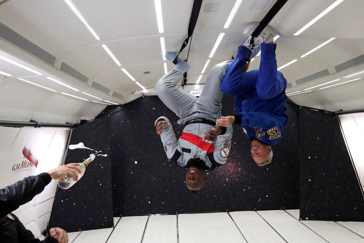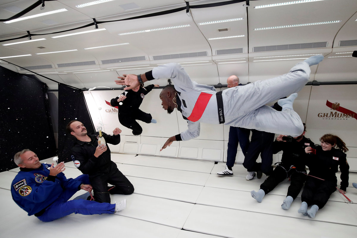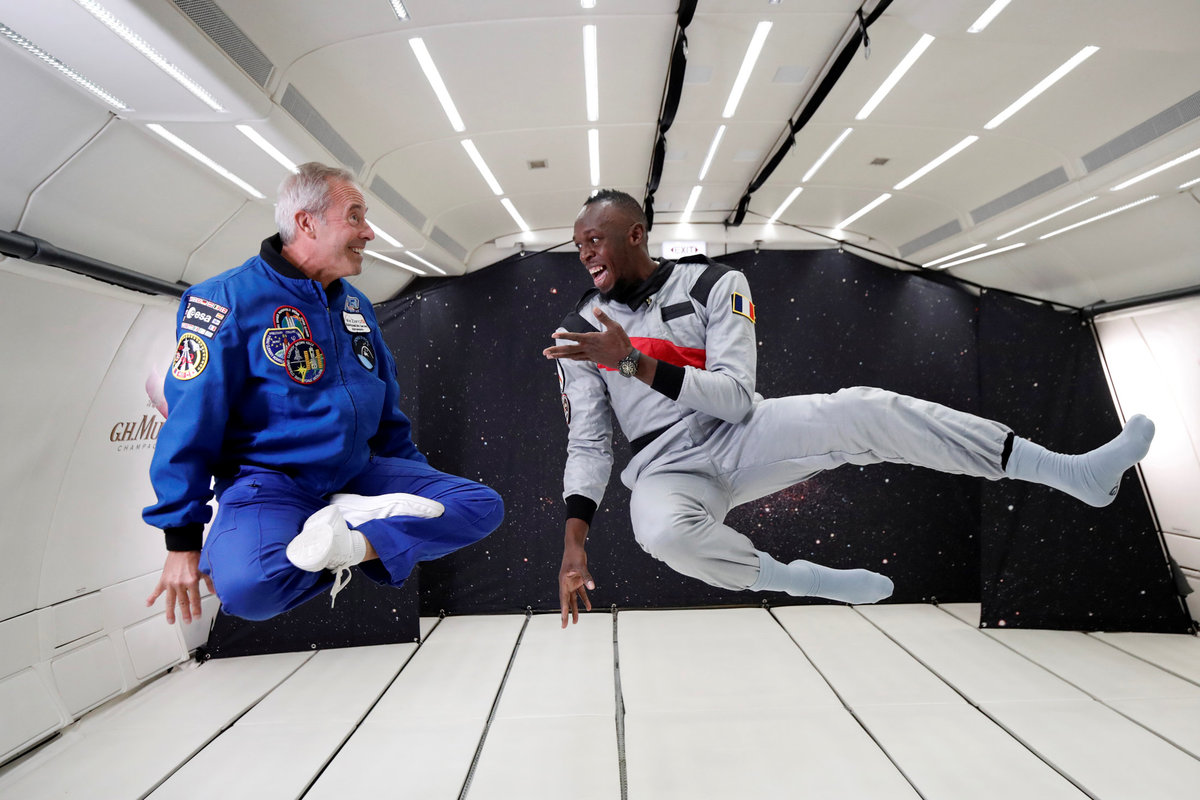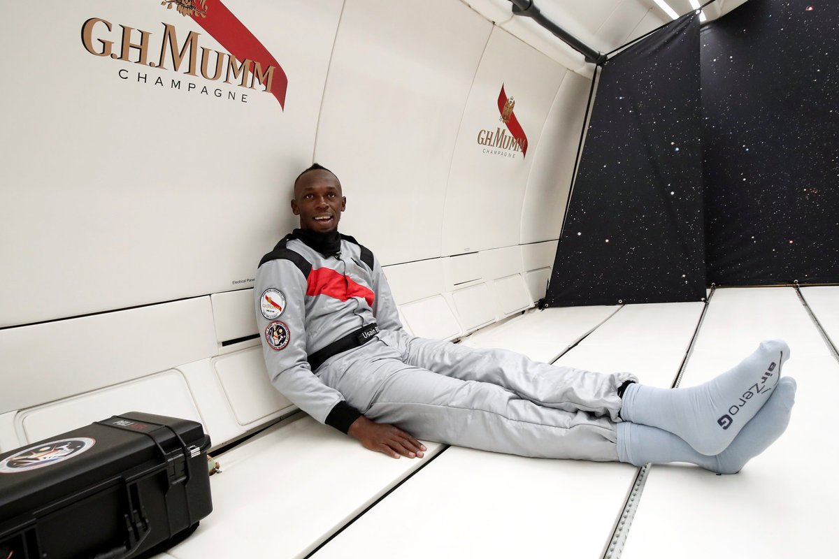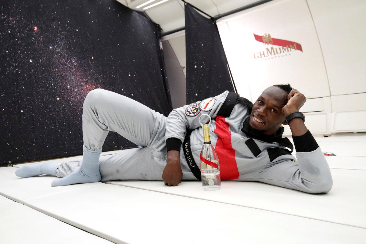 Retired sprinter Usain Bolt and French astronaut Jean-Francois Clervoy, CEO of Novespace, enjoy zero gravity conditions during a flight in a specially modified plane above Reims, France, September 12, 2018. REUTERS/Benoit TessierRetired sprinter Usain Bolt, French astronaut Jean-Francois Clervoy, CEO of Novespace, and French Interior designer Octave de Gaulle who designed a bottle of "Mumm Grand Cordon Stellar" enjoy zero gravity conditions during a flight in a specially modified Airbus Zero-G plane above Reims, France, September 12, 2018. REUTERS/Benoit TessierRetired sprinter Usain Bolt and French Interior designer Octave de Gaulle who designed a bottle of "Mumm Grand Cordon Stellar" champagne enjoy zero gravity conditions during a flight in a specially modified Airbus Zero-G plane above Reims, France, September 12, 2018. REUTERS/Benoit TessierRetired sprinter Usain Bolt poses as he enjoys zero gravity conditions during a flight in a specially modified plane above Reims, France, September 12, 2018. REUTERS/Benoit TessierRetired sprinter Usain Bolt poses with staff members holding a bottle of "Mumm Grand Cordon Stellar" champagne after they enjoy zero gravity conditions during a flight in a specially modified Airbus Zero-G plane above Reims, France, September 12, 2018. REUTERS/Benoit TessierRetired sprinter Usain Bolt and French astronaut Jean-Francois Clervoy, CEO of Novespace, are spayed with champagne from a bottle of "Mumm Grand Cordon Stellar" designed by French Interior designer Octave de Gaulle as they enjoy zero gravity conditions during a flight in a specially modified Airbus Zero-G plane above Reims, France, September 12, 2018. REUTERS/Benoit TessierRetired sprinter Usain Bolt and French astronaut Jean-Francois Clervoy, CEO of Novespace, enjoy zero gravity conditions during a flight in a specially modified plane above Reims, France, September 12, 2018. REUTERS/Benoit TessierRetired sprinter Usain Bolt, French astronaut Jean-Francois Clervoy, CEO of Novespace and French Interior designer Octave de Gaulle who designed a bottle of "Mumm Grand Cordon Stellar" champagne enjoy zero gravity conditions during a flight in a specially modified Airbus Zero-G plane above Reims, France, September 12, 2018. REUTERS/Benoit TessierRetired sprinter Usain Bolt poses next to the logo of Mumm Grand Cordon Stellar champagne inside a specially modified Airbus Zero-G plane before a zero gravity conditions flight above Reims, France, September 12, 2018. REUTERS/Benoit TessierRetired sprinter Usain Bolt, French astronaut Jean-Francois Clervoy, CEO of Novespace and French Interior designer Octave de Gaulle who designed a bottle of "Mumm Grand Cordon Stellar" enjoy zero gravity conditions during a flight in a specially modified Airbus Zero-G plane above Reims, France, September 12, 2018. REUTERS/Benoit TessierRetired sprinter Usain Bolt and French astronaut Jean-Francois Clervoy, CEO of Novespace, enjoy zero gravity conditions during a flight in a specially modified Airbus Zero-G plane above Reims, France, September 12, 2018. REUTERS/Benoit TessierRetired sprinter Usain Bolt poses before a zero gravity conditions flight above Reims, France, September 12, 2018. REUTERS/Benoit TessierA view shows a specially modified Airbus Zero-G plane before a zero gravity conditions flight above Reims, France, September 12, 2018. REUTERS/Benoit TessierRetired sprinter Usain Bolt, French astronaut Jean-Francois Clervoy, CEO of Novespace, and Quentin Meurisse from Martell Mumm Perrier-Jou‘t after they enjoyed zero gravity conditions during a flight in a specially modified Airbus Zero-G plane above Reims, France, September 12, 2018. REUTERS/Benoit TessierRetired sprinter Usain Bolt and Quentin Meurisse from Martell Mumm Perrier-Jou‘t after they enjoyed zero gravity conditions during a flight in a specially modified Airbus Zero-G plane above Reims, France, September 12, 2018. REUTERS/Benoit TessierRetired sprinter Usain Bolt, French astronaut Jean-Francois Clervoy, CEO of Novespace, and Quentin Meurisse from Martell Mumm Perrier-Jou‘t after they enjoyed zero gravity conditions during a flight in a specially modified Airbus Zero-G plane above Reims, France, September 12, 2018. REUTERS/Benoit Tessier