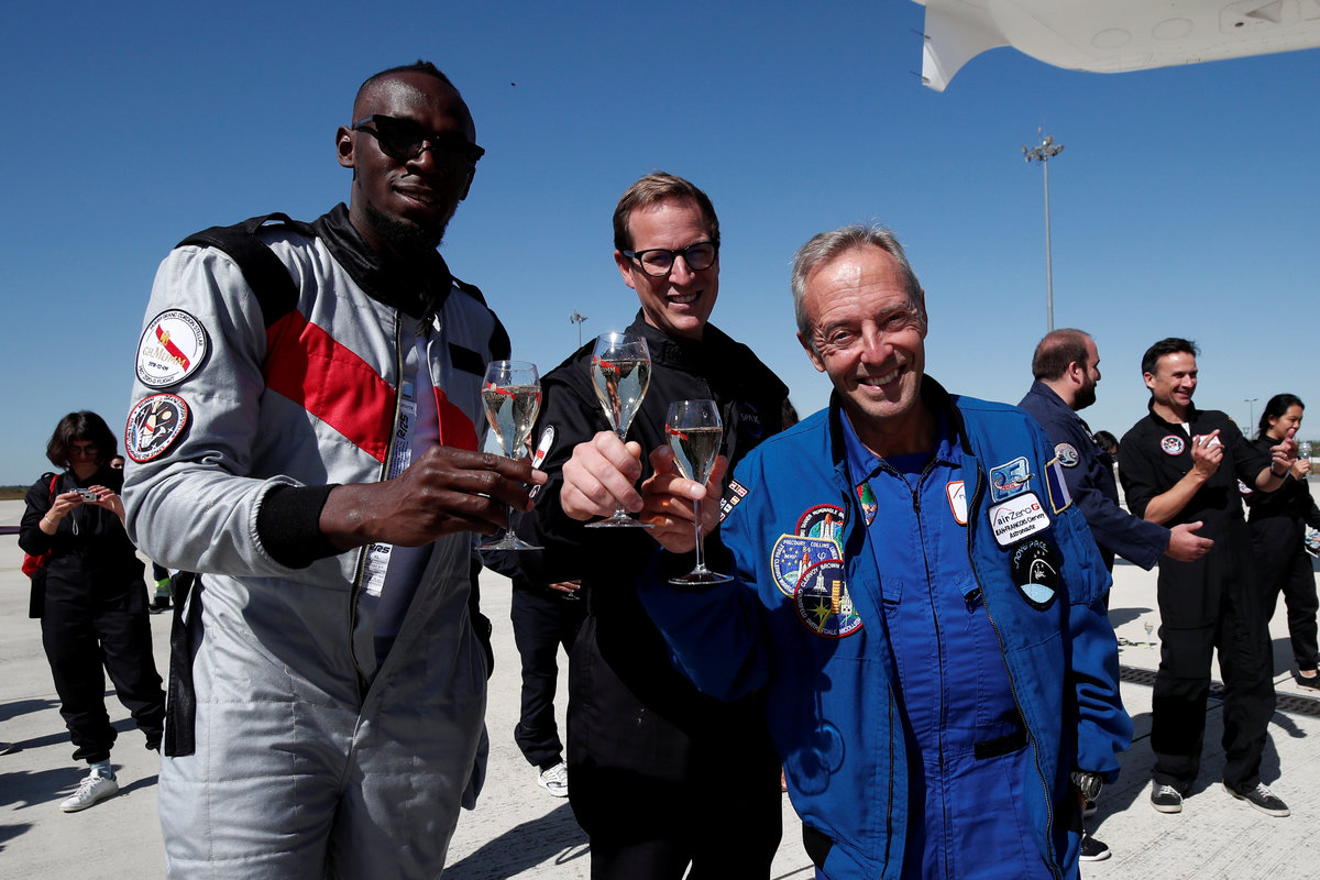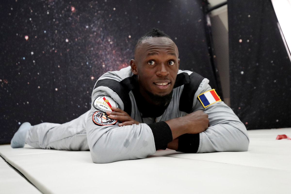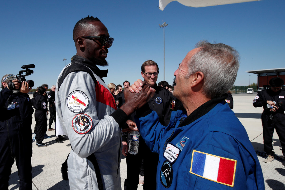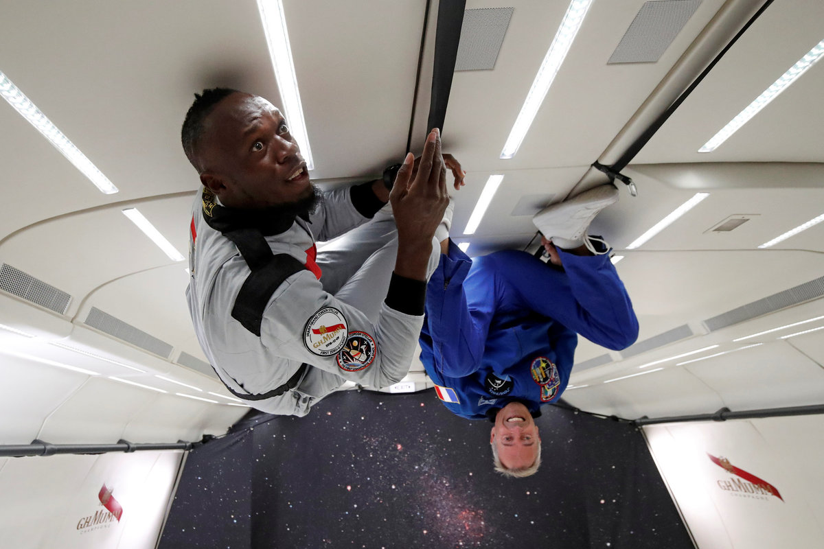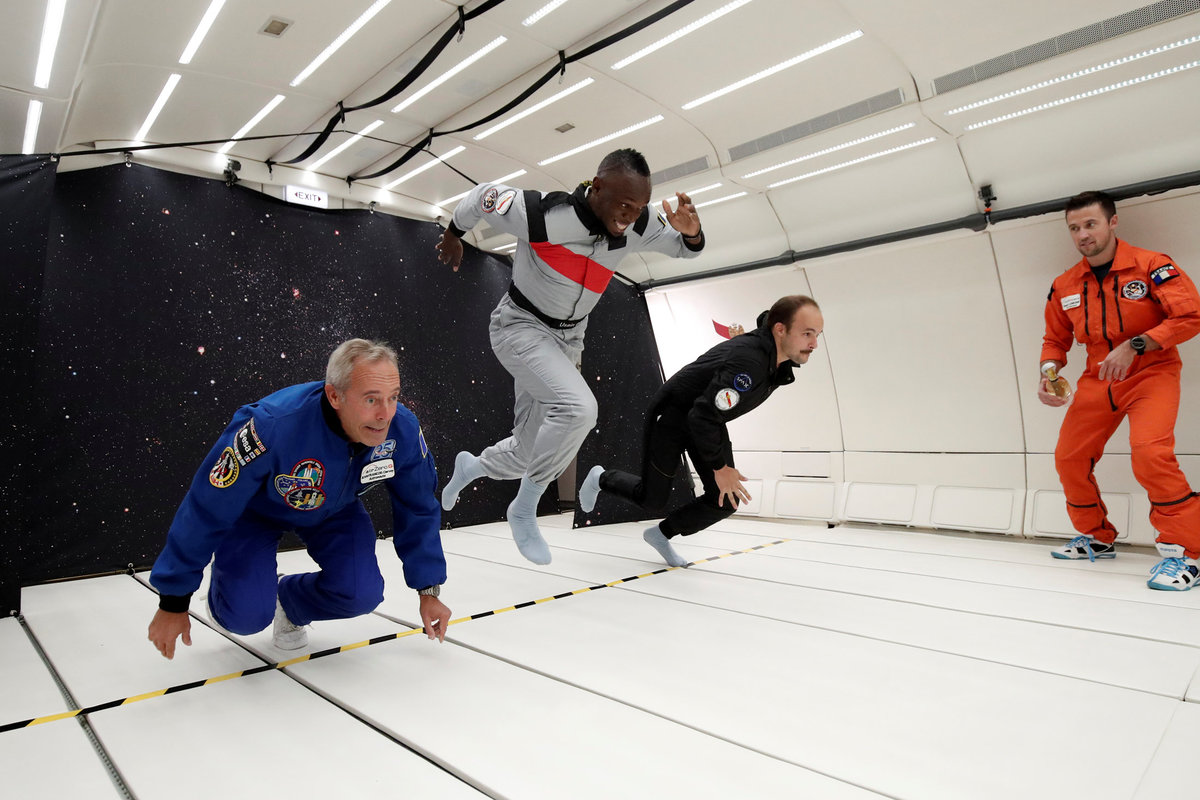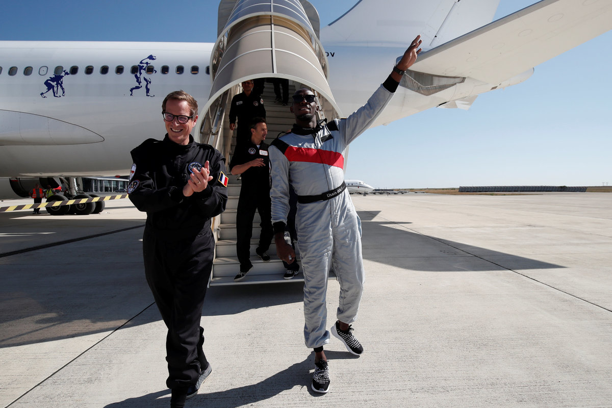 Retired sprinter Usain Bolt and French astronaut Jean-Francois Clervoy, CEO of Novespace, enjoy zero gravity conditions during a flight in a specially modified plane above Reims, France, September 12, 2018. REUTERS/Benoit TessierRetired sprinter Usain Bolt, French astronaut Jean-Francois Clervoy, CEO of Novespace, and French Interior designer Octave de Gaulle who designed a bottle of "Mumm Grand Cordon Stellar" enjoy zero gravity conditions during a flight in a specially modified Airbus Zero-G plane above Reims, France, September 12, 2018. REUTERS/Benoit TessierRetired sprinter Usain Bolt and French Interior designer Octave de Gaulle who designed a bottle of "Mumm Grand Cordon Stellar" champagne enjoy zero gravity conditions during a flight in a specially modified Airbus Zero-G plane above Reims, France, September 12, 2018. REUTERS/Benoit TessierRetired sprinter Usain Bolt poses as he enjoys zero gravity conditions during a flight in a specially modified plane above Reims, France, September 12, 2018. REUTERS/Benoit TessierRetired sprinter Usain Bolt poses with staff members holding a bottle of "Mumm Grand Cordon Stellar" champagne after they enjoy zero gravity conditions during a flight in a specially modified Airbus Zero-G plane above Reims, France, September 12, 2018. REUTERS/Benoit TessierRetired sprinter Usain Bolt and French astronaut Jean-Francois Clervoy, CEO of Novespace, are spayed with champagne from a bottle of "Mumm Grand Cordon Stellar" designed by French Interior designer Octave de Gaulle as they enjoy zero gravity conditions during a flight in a specially modified Airbus Zero-G plane above Reims, France, September 12, 2018. REUTERS/Benoit TessierRetired sprinter Usain Bolt and French astronaut Jean-Francois Clervoy, CEO of Novespace, enjoy zero gravity conditions during a flight in a specially modified plane above Reims, France, September 12, 2018. REUTERS/Benoit TessierRetired sprinter Usain Bolt, French astronaut Jean-Francois Clervoy, CEO of Novespace and French Interior designer Octave de Gaulle who designed a bottle of "Mumm Grand Cordon Stellar" champagne enjoy zero gravity conditions during a flight in a specially modified Airbus Zero-G plane above Reims, France, September 12, 2018. REUTERS/Benoit TessierRetired sprinter Usain Bolt poses next to the logo of Mumm Grand Cordon Stellar champagne inside a specially modified Airbus Zero-G plane before a zero gravity conditions flight above Reims, France, September 12, 2018. REUTERS/Benoit TessierRetired sprinter Usain Bolt, French astronaut Jean-Francois Clervoy, CEO of Novespace and French Interior designer Octave de Gaulle who designed a bottle of "Mumm Grand Cordon Stellar" enjoy zero gravity conditions during a flight in a specially modified Airbus Zero-G plane above Reims, France, September 12, 2018. REUTERS/Benoit TessierRetired sprinter Usain Bolt and French astronaut Jean-Francois Clervoy, CEO of Novespace, enjoy zero gravity conditions during a flight in a specially modified Airbus Zero-G plane above Reims, France, September 12, 2018. REUTERS/Benoit TessierRetired sprinter Usain Bolt poses before a zero gravity conditions flight above Reims, France, September 12, 2018. REUTERS/Benoit TessierA view shows a specially modified Airbus Zero-G plane before a zero gravity conditions flight above Reims, France, September 12, 2018. REUTERS/Benoit TessierRetired sprinter Usain Bolt, French astronaut Jean-Francois Clervoy, CEO of Novespace, and Quentin Meurisse from Martell Mumm Perrier-Jou‘t after they enjoyed zero gravity conditions during a flight in a specially modified Airbus Zero-G plane above Reims, France, September 12, 2018. REUTERS/Benoit TessierRetired sprinter Usain Bolt and Quentin Meurisse from Martell Mumm Perrier-Jou‘t after they enjoyed zero gravity conditions during a flight in a specially modified Airbus Zero-G plane above Reims, France, September 12, 2018. REUTERS/Benoit TessierRetired sprinter Usain Bolt, French astronaut Jean-Francois Clervoy, CEO of Novespace, and Quentin Meurisse from Martell Mumm Perrier-Jou‘t after they enjoyed zero gravity conditions during a flight in a specially modified Airbus Zero-G plane above Reims, France, September 12, 2018. REUTERS/Benoit Tessier