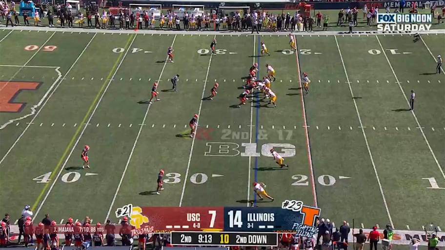 Early in the second quarter of No. 21 USC's matchup against No. 23 Illinois at Gies Memorial Stadium, the Trojans dialed up one of the more creative trick plays you'll see. Facing a second-and-17 and trailing by a touchdown, the Trojans split quarterback Jayden Maiava out wide in the wildcat formation. Waymond Jordan and Eli Sanders ran the zone read, and the junior running back kept the ball and sprinted to his right. Jordan flipped the ball to Maiava, who slung the ball deep to a wide-open Makai Lemon.