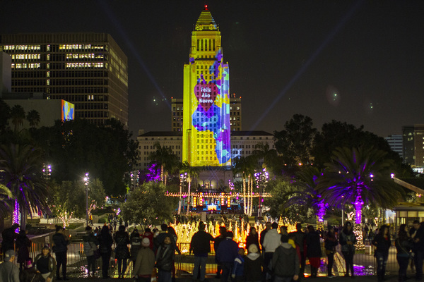 Yu and his team of designers have projected New Year's Eve light shows onto Los Angeles City Hall since 2015. The projections, which covered the historic building's nearly 30-story face, not only featured dazzling 3-D effects but also each had unique narrative themes. One followed a young boy as he explored different neighborhoods in LA and discovered the history of the city.