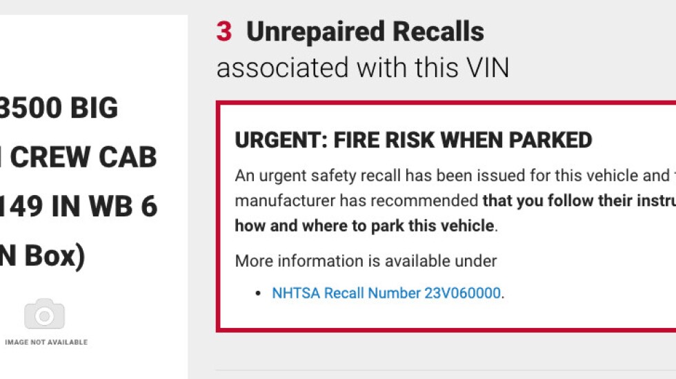 - AutoNation.com listed four used Ram 3500 trucks with open recalls, including a 2021 model priced at $52,399 that had three open recalls, two that could lead to a vehicle fire.