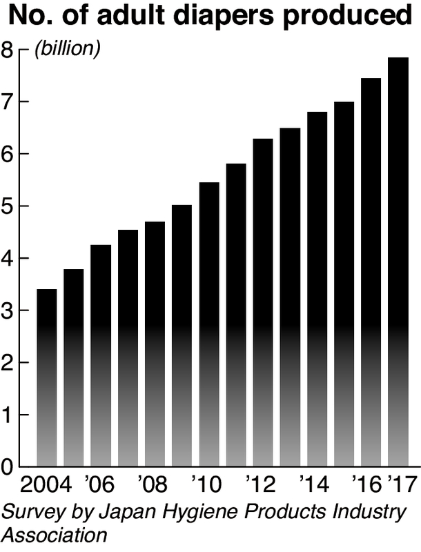 According to the Tokyo-based Japan Hygiene Products Industry Association, about 7.8 billion adult diapers were produced in 2017, an increase of about 3.3 billion diapers from 10 years ago.