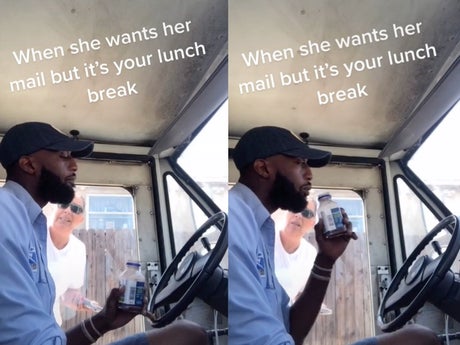 In the clip, which he captioned: “When she wants her mail but it’s your lunch break,” he can be seen sitting in his truck and drinking a juice while he sings along to Sure Thing by Miguel as a woman attempts to speak to him through the window.
