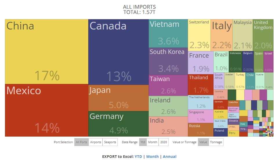 Sure, the United States still gets more of its imports from China than any other nation, though that percentage has dropped this year to 17% from 19%. In 2017, that percentage was 21.58%.