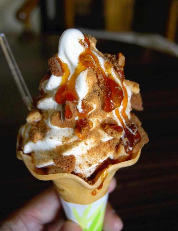 The soft ice cream is made by the mother of the current 12th president. It has a rich but refreshing taste. "I started making this about 10 years ago. People visit us from other prefectures to enjoy it," she said. Served in a cone, this ice cream is priced at 350, yen while a small-cup serving costs 250 yen.