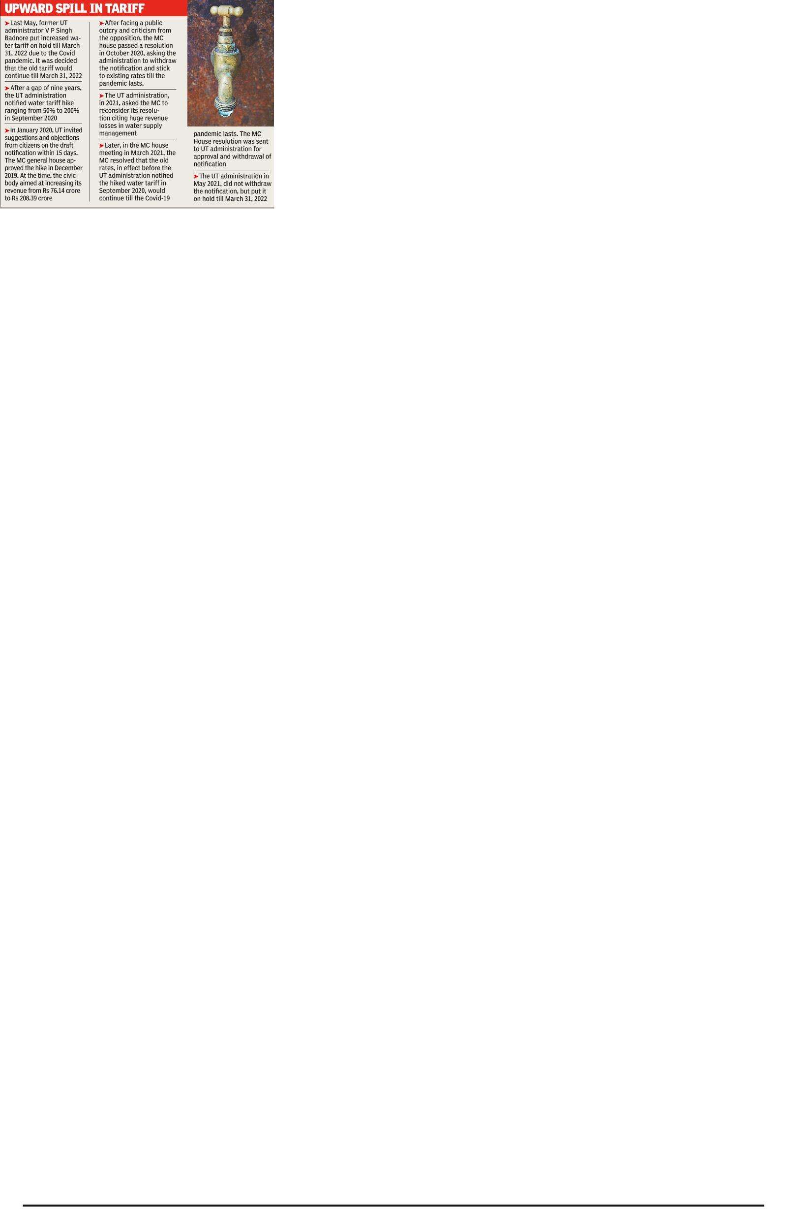 After the MC house approval, UT administration notified an increase in water tariff between 50% and 200%, depending upon the category of user and water consumption level. It was later suspended till March 31, 2022 citing the Covid pandemic.