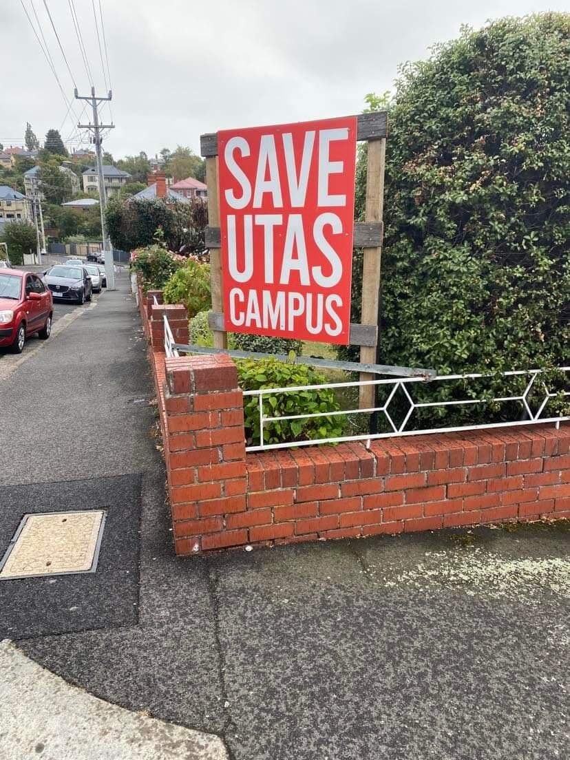 Bright red signs have sprung up around Hobart emblazoned with SAVE UTAS CAMPUS promoting a campaign by the same name led by former history academic Pam Sharpe.