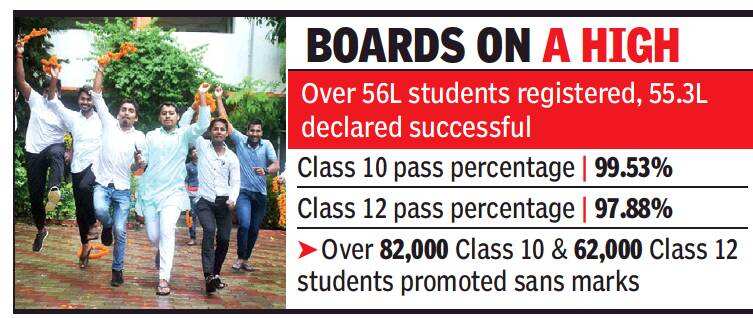 LUCKNOW: In a year marred by the Covid-19 crisis that forced Uttar Pradesh Secondary Education Board (UPSEB) to cancel Board examinations for the first time in its 100-year history, 99.53% class 10 students and 97.88% class 12 students were declared successful on Saturday. In the absence of examinations, there was no merit list in the results tally.