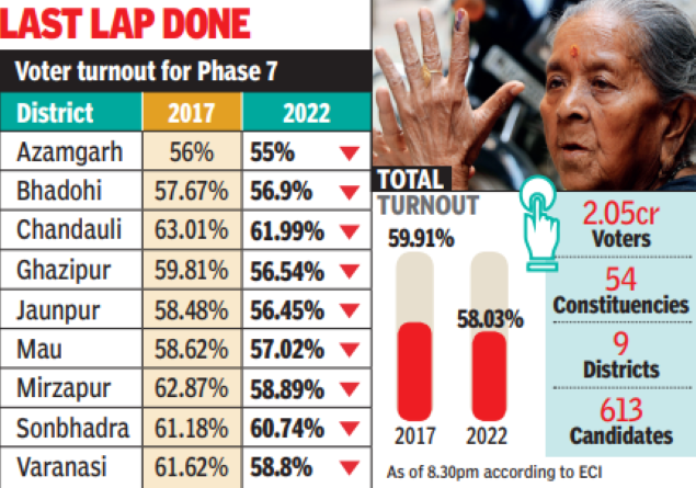 According to Election Commission data at 10pm, 58% polling in the final leg was much below the 2017 turnout of 59.9%. The final data would be released on Friday. As many as 613 candidates were in the fray in this round, which was held in Azamgarh, Mau, Jaunpur, Ghazipur, Chandauli, Varanasi, Mirzapur, Sonbhadra and Bhadohi.