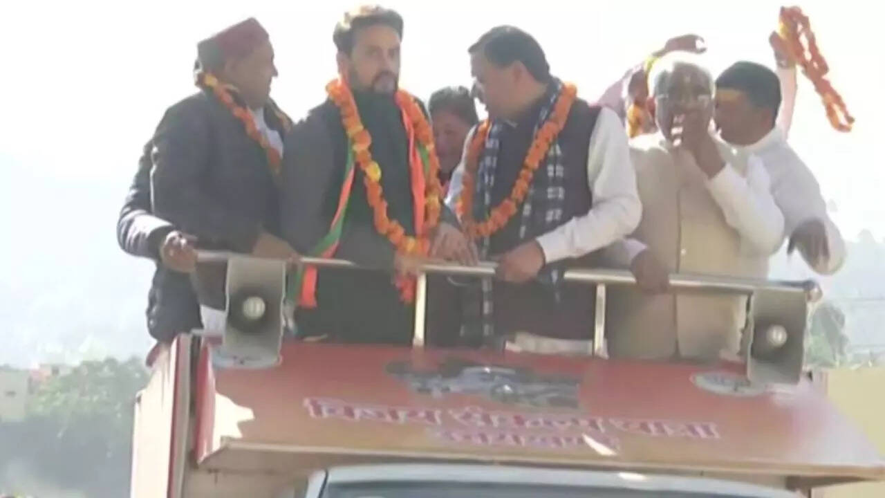 BAGESHWAR (UTTARAKHAND): Ahead of the Uttarakhand assembly polls, Union minister Anurag Thakur and chief minister Pushkar Singh Dhami led Bharatiya Janata Party's (BJP) 'Vijay Sankalp Yatra' in Bageshwar district on Sunday.