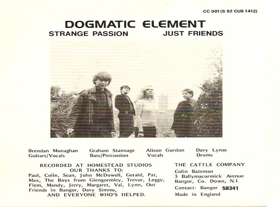 If the imagery of punk had been visceral, the post-punk style was cold and minimalist. Take Dogmatic Element, a Bangor group fronted by singer Alison Gordon. The back cover for their single “Just Friends”, a tight guitar tune, features a grayscale photo on the band taken at the entrance of Scrabo Tower, all dirty jackets, unironed trousers and unkempt hair caught in the wind. Call it their Salford Lads’ Club moment.