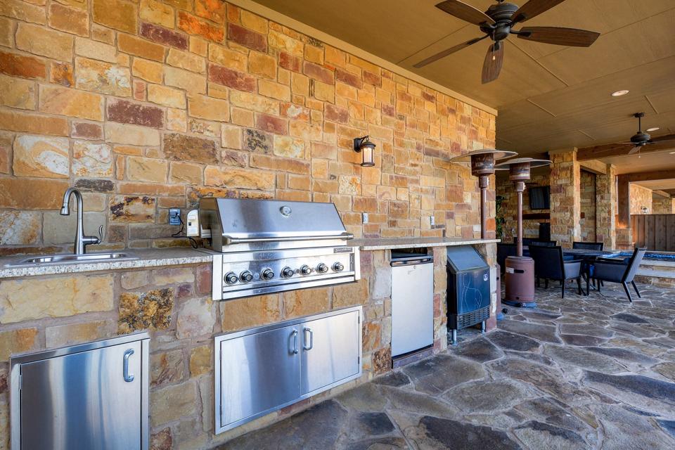 Lake Travis, TX: Top-of-the-world views of Lake Travis are yours at this immaculate Spicewood Villa. The outdoor living room has lovely plush furniture, a gas fireplace and a 55” TV. A matching dining set seats eight, and a gourmet outdoor kitchen has a six-burner grill, mini-fridge and wet bar. Restaurant-quality outdoor heaters let you enjoy this luxe outdoor space any season.