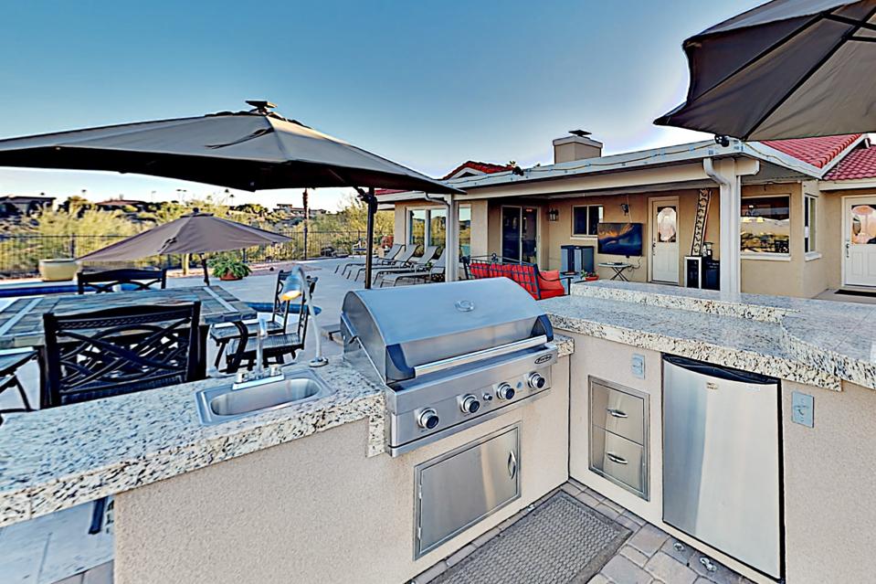 Fountain Hills, AZ: Enjoy stunning views of the Four Peaks from your private pool at this sophisticated 4BR/3.5BA getaway. With a gas grill, dishwasher and wet bar, the outdoor kitchen is a chef’s dream complete with polished bar and adjacent dining table. There’s also a beverage fridge in the shaded lounge. Kick back and watch the game on the smart TV.