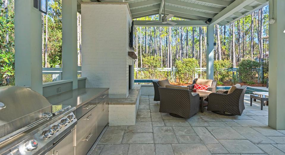 South Walton, FL: A gem of a home named Wanderlust in Watercolor boasts a private pool and is within walking distance from a sugar-white stretch of sand. The home’s outdoor lounge is the perfect entertaining space, featuring a huge outdoor kitchen, gas fireplace and 68” wall-mounted TV. Overlooking the pool, a screened porch with a picnic table and wooden table is ideal for casual dining.