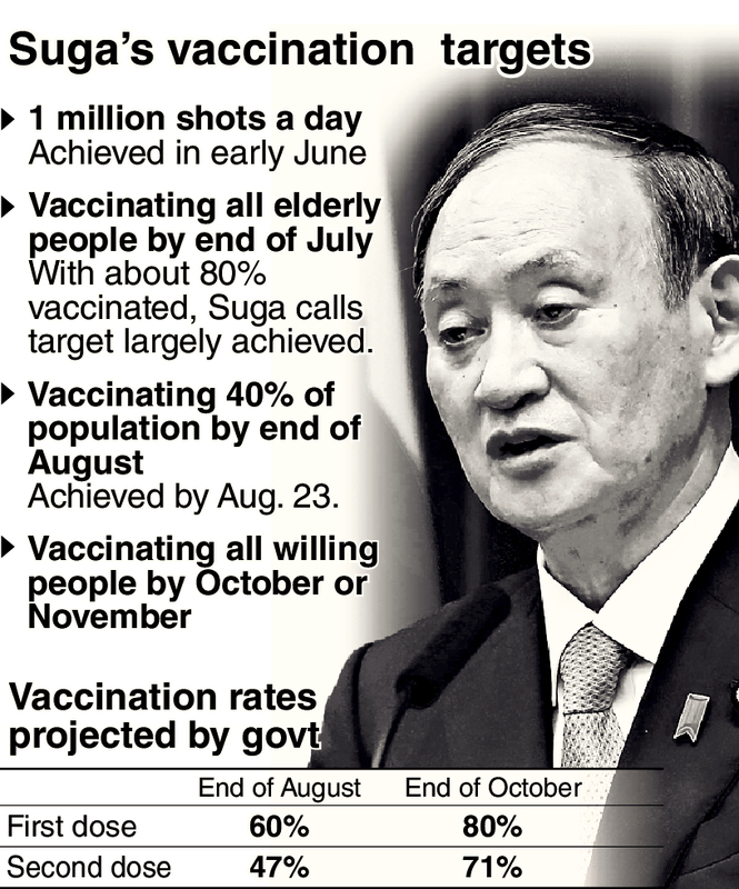 Suga has been focusing on the 40% vaccination rate because overseas cases suggested clear benefits in preventing the spread of infections when that level of inoculation was achieved. However, the spread of the more infectious delta variant has thwarted Suga's hopes.
