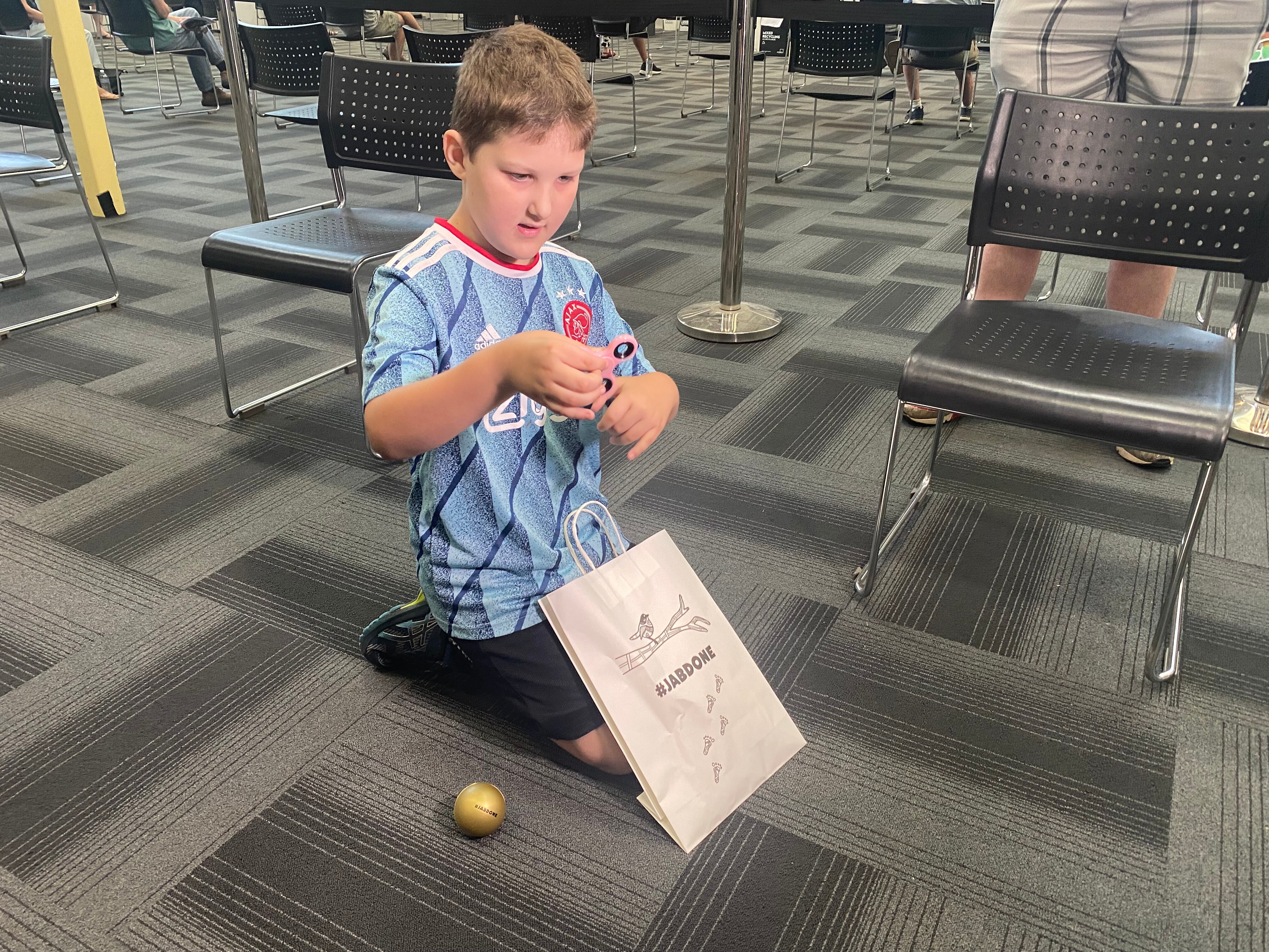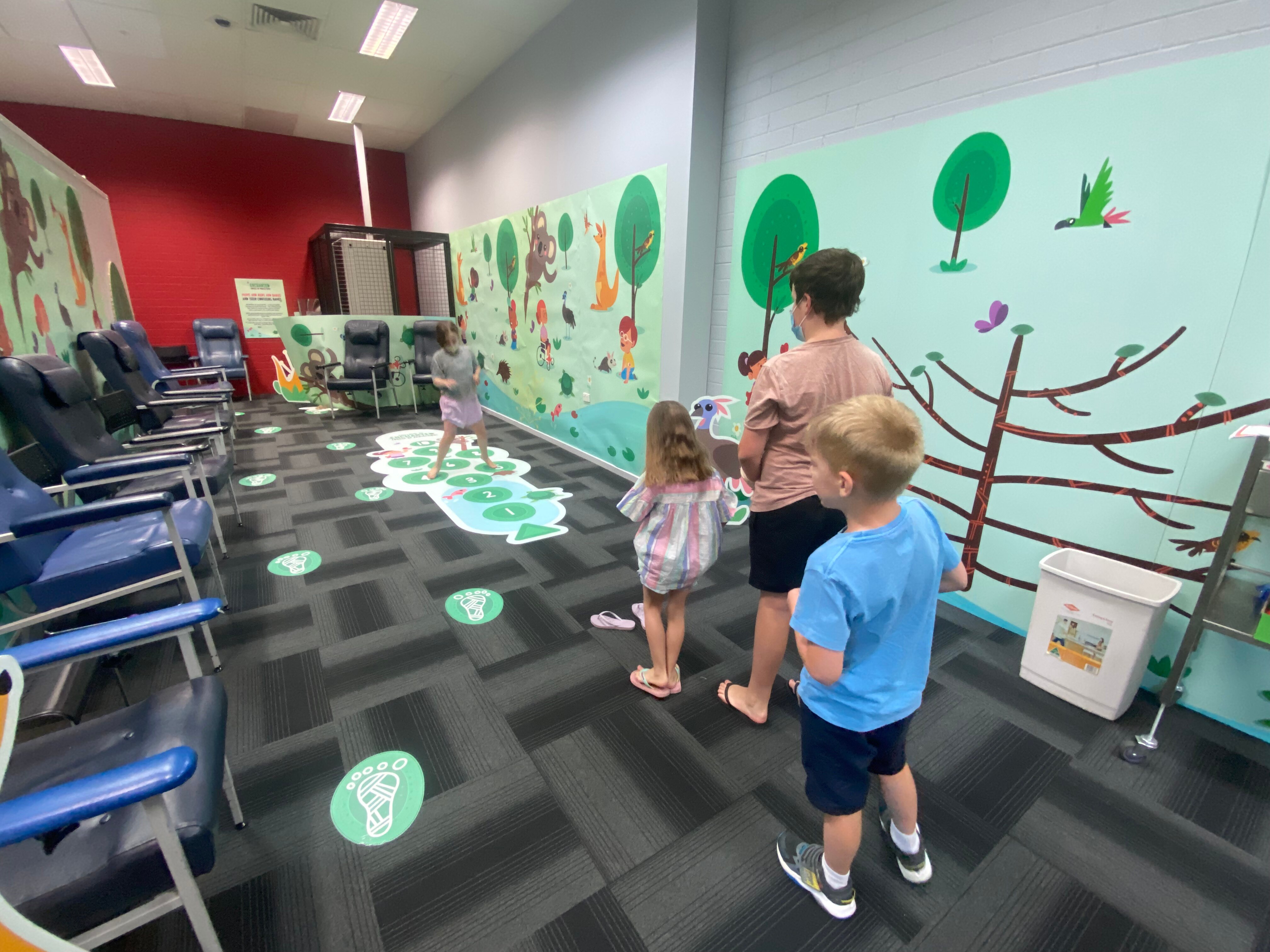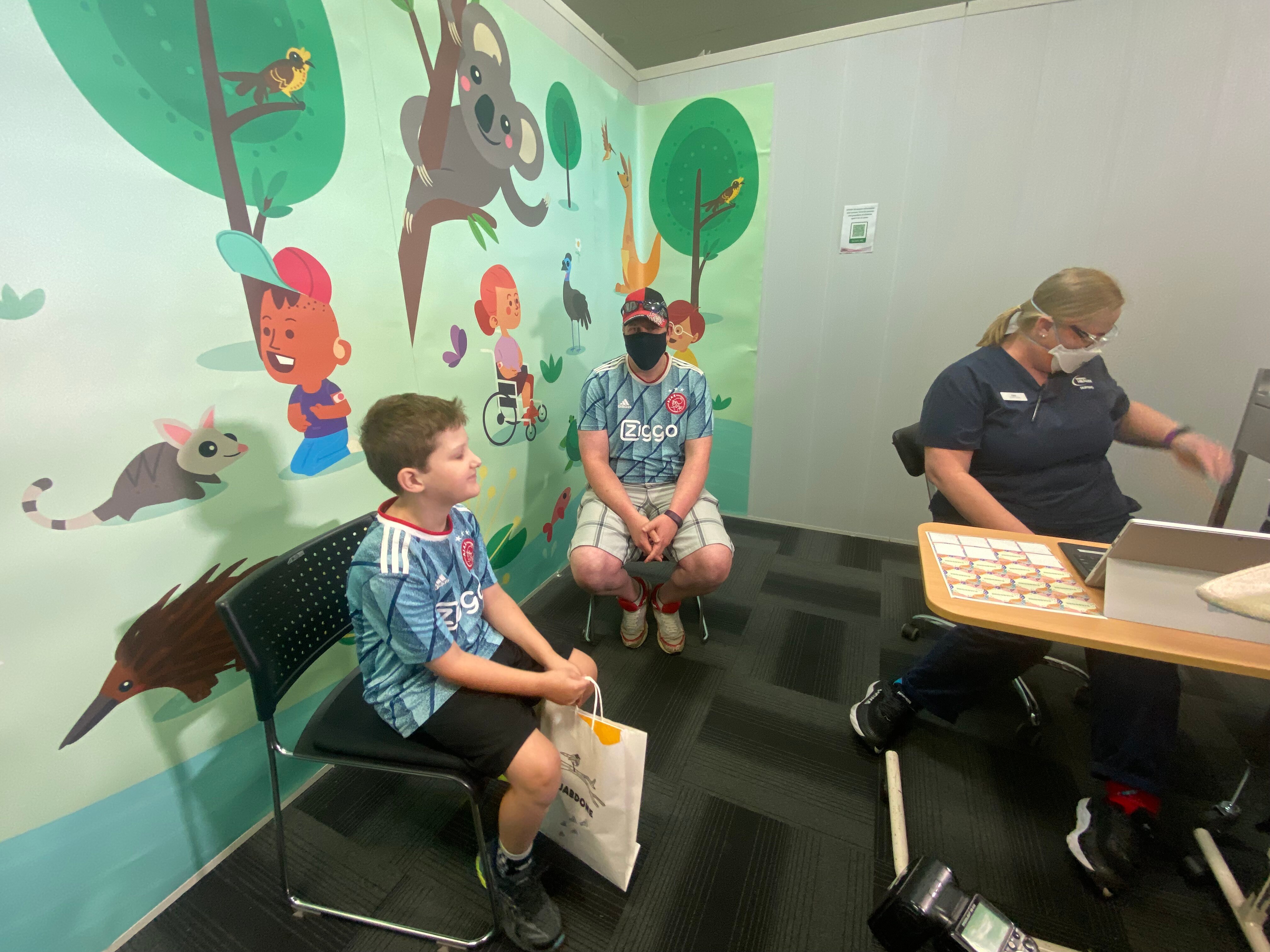 Vaccination hubs have been decorated in a forest theme to make the experience easier for children, with showbags on offer for kids following their shot.
