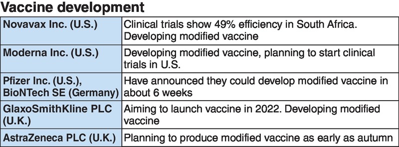 Moderna has announced that it will create a vaccine that works against the South African variant and begin clinical trials in the United States. British firm AstraZeneca PLC is expected to begin production of a modified vaccine as early as autumn. Pfizer is currently verifying the efficacy of a vaccine against the South African variant that is under review for approval in Japan. BioNTech SE of Germany, which jointly developed a vaccine with Pfizer, announced Tuesday that it could develop a vaccine against new variants in around six weeks.