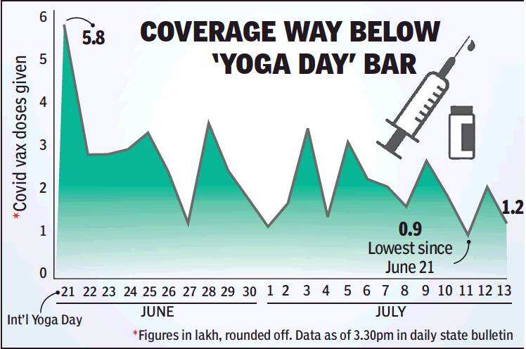 BENGALURU: On International Yoga Day (June 21), the state government had announced that it would aim for 7 lakh vaccinations a day but a review of the number of doses administered since shows Karnataka is struggling to inoculate even 2 lakh people on most days.