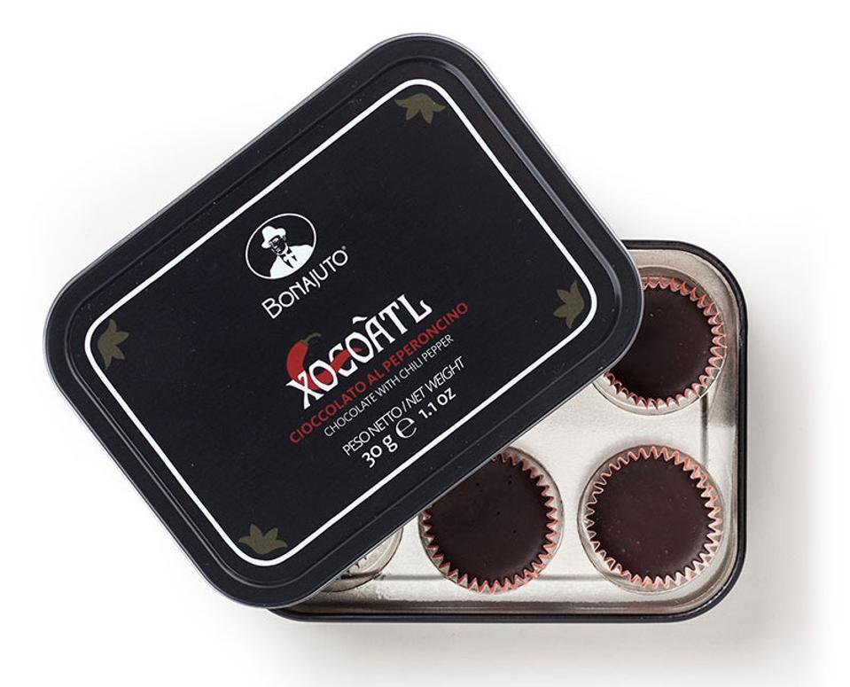 Modica is a city in southeast Sicily known for its chocolates. This “antique” tin packaging of the small batch, fair trade chocolates made by Bonajuto reflects the company’s long history, having been made the same way for nearly 150 years (in fact, predating the Industrial Revolution and the birth of smooth chocolates). Bonajuto chocolates are made with only three ingredients: cocoa, sugar and spices (including hot red pepper, first used by Aztec chocolate makers). The textured red pepper chocolate truffles are dense, crystalline and a little spicy.
