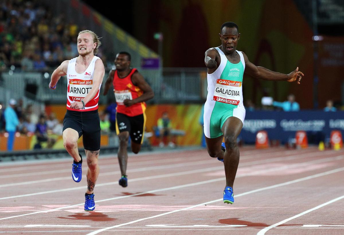 As the crowd roared their support, the Englishman made a great start out of his blocks only for Nigeria's Suwaibidu Galadima to storm past him with a blistering finish to claim gold.