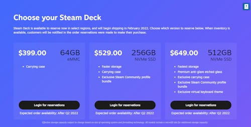 There are three versions of the Steam Deck available — a 64 GB, 256GB and a 512GB. For gamers will a lot of AAA titles on their PCs, a larger size will be essential — unless you only want to be able to access a game or two at a time. The 64GB will cost $399, the 256GB will cost $529 and the 512GB will cost $649.