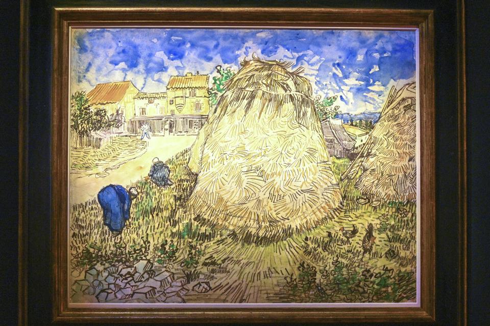 “Meules de blé” shattered auction estimates, which pegged the painting to sell for between $20 million and $30 million. Before the watercolor was displayed at Christie’s London and New York showrooms, the painting had not been seen in public in more than 100 years since it was featured in a massive Van Gogh retrospective at Amsterdam’s Stedelijk Museum, according to Christie’s. Six months after Van Gogh painted the haystacks in “Meules de blé,” his plans to launch an artists colony fell through. After an argument with Gauguin in December 1888, Van Gogh suffered a nervous breakdown during which he famously sliced off his own ear to give to a local woman in Arles. The previously most expensive Van Gogh painting on paper was “La Moisson En Provence,” which sold for nearly $15 million in 1997.