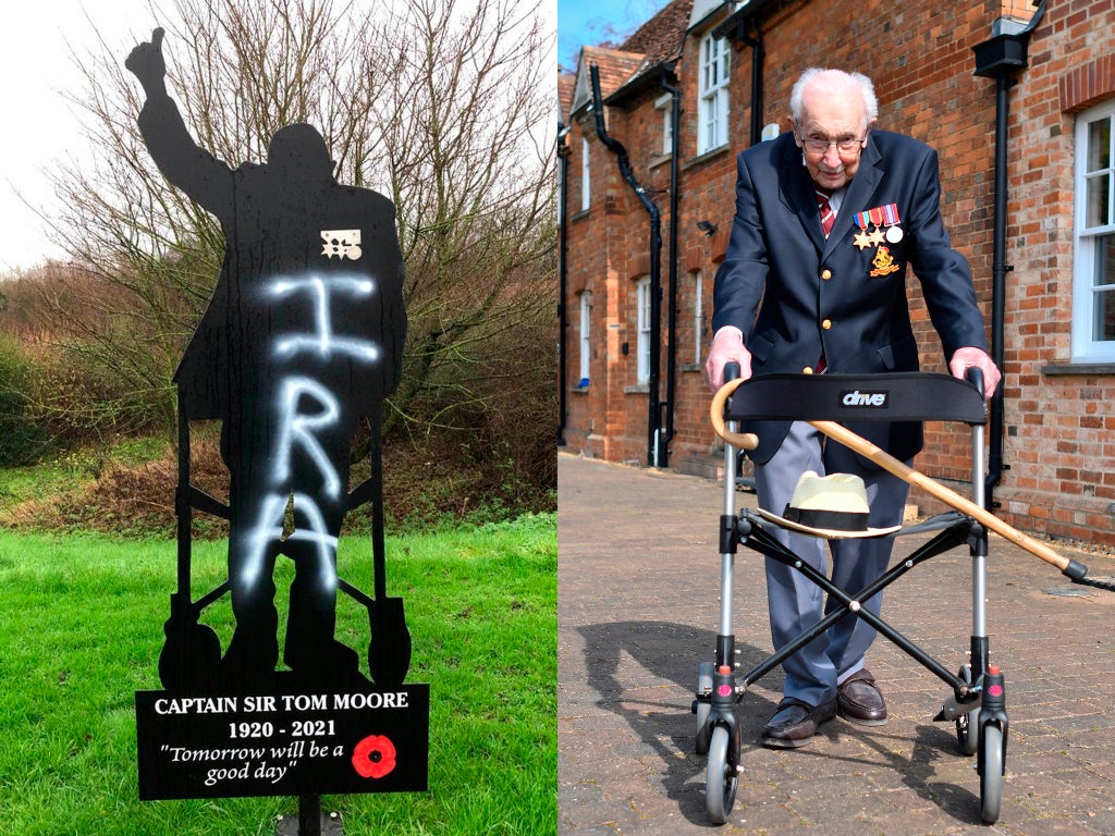 Police are appealing for information after vandals sprayed graffiti reading “IRA” over a life-size memorial to the late Captain Sir Tom Moore.