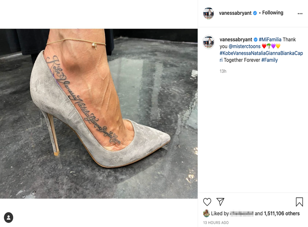 An hour later, the 38-year-old posted a close-up picture of her foot, showing the names “Kobe, Vanessa, Natalia, Gianna, Bianka and Capri” tattooed along the side in cursive handwriting.