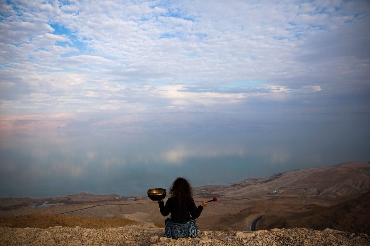 Jade holds a Tibetan singing bowl as she sits on a cliff overlooking the Dead Sea, near Metzoke Dragot in the Israeli occupied West Bank, February 20, 2018. REUTERS/Ronen Zvulun