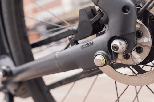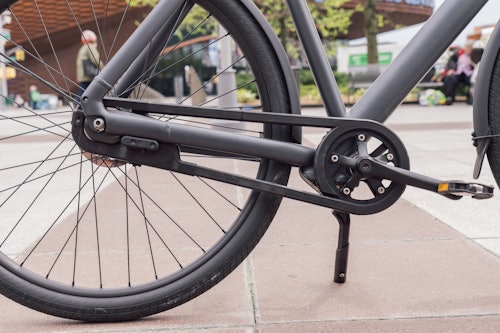 VanMoof's drivetrain is an interesting case: the motor is relatively small at 250-350 watts (likely to comply with European law,) and it’s a hub motor instead of a mid-drive motor, which is what many high-end bikes are using at the moment. Then the power is delivered with a regular chain to the Sturmey-Archer internally geared hub, which is also an interesting (but necessary) choice.