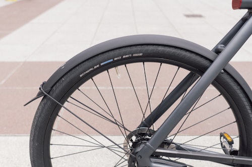 The tires that VanMoof used on my early-model S3 are 28-inch Schwalbe Big Bens. These have a road tread, but they’re very wide and very thick. We’ll talk more about bumps in a bit, but these chubby tires are absolutely necessary for a bike that weighs 41 pounds. The mud guards that VanMoof has installed here look great, and I’m sure many of the people that are interested in the S3 will appreciate getting to work (when that’s eventually an option) without being covered in mud. I would probably change the tires for something a little knobbier just to have fun with it (I do own a Sur Ron, after all) but I’m not sure that’s possible given how close the mud guards are to the tires.