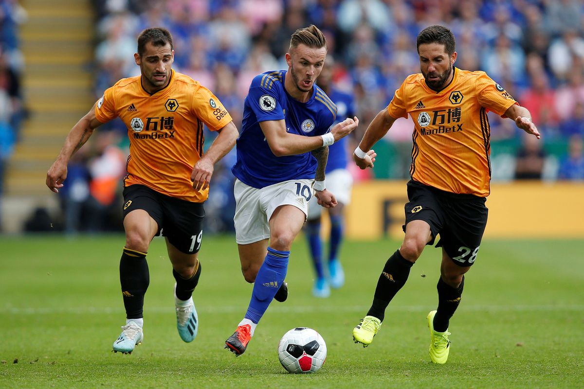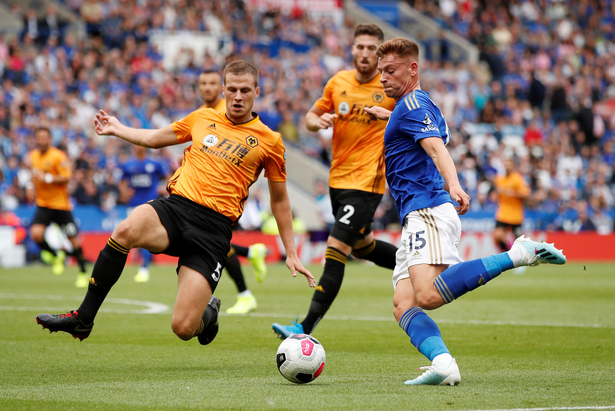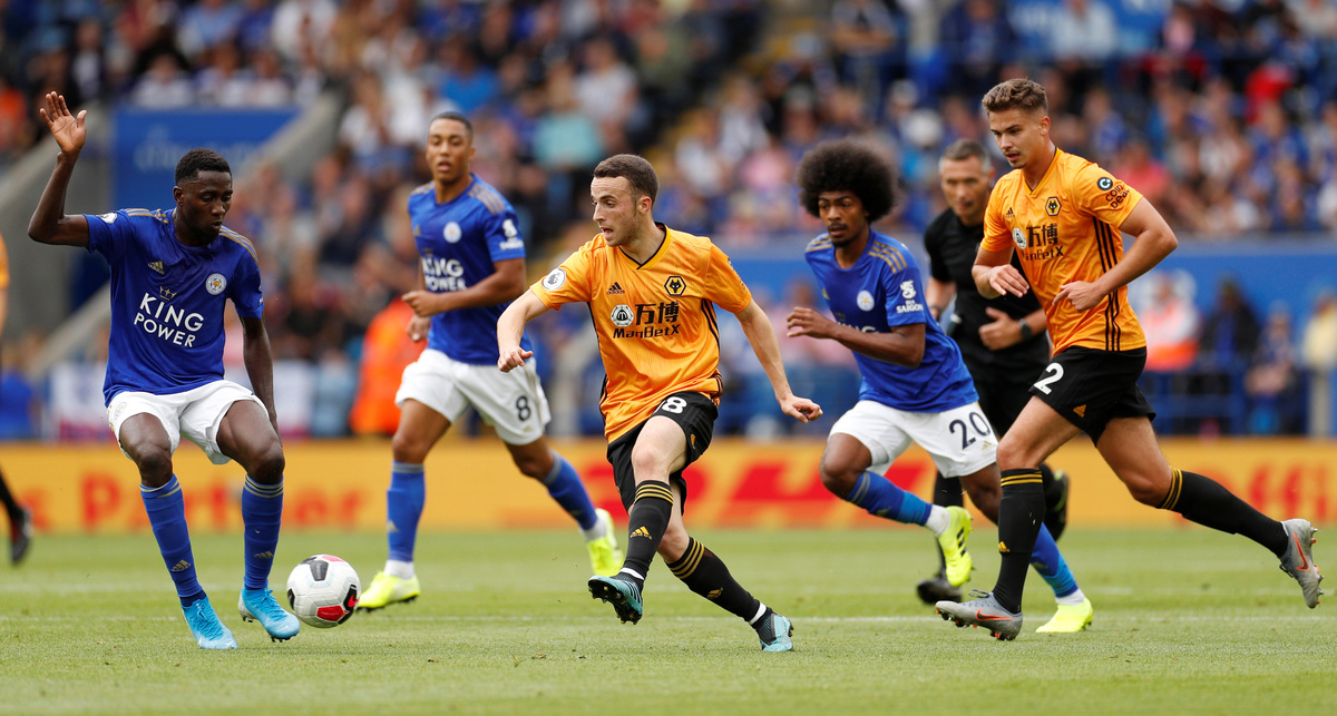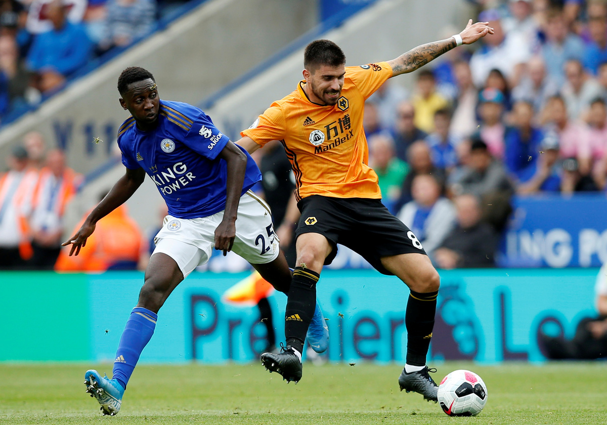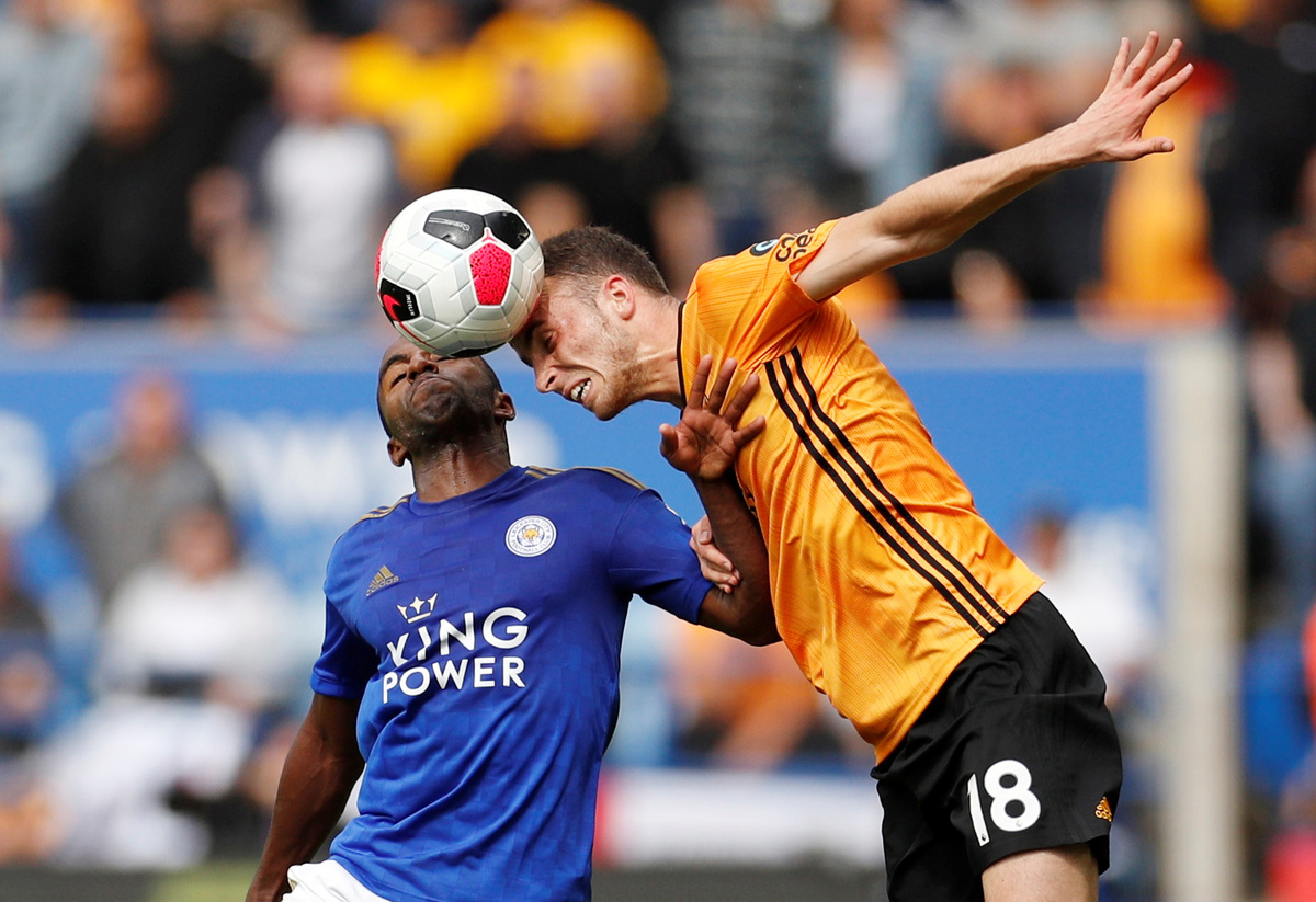 Soccer Football - Premier League - Leicester City v Wolverhampton Wanderers - King Power Stadium, Leicester, Britain - August 11, 2019 Leicester City's Jonny Evans in action as Wolverhampton Wanderers' Willy Boly and Leicester City's Caglar Soyuncu look on Action Images via Reuters/John Sibley Soccer Football - Premier League - Leicester City v Wolverhampton Wanderers - King Power Stadium, Leicester, Britain - August 11, 2019 Leicester City's James Maddison in action with Wolverhampton Wanderers' Jonny and Joao Moutinho REUTERS/Andrew Yates Soccer Football - Premier League - Leicester City v Wolverhampton Wanderers - King Power Stadium, Leicester, Britain - August 11, 2019 Wolverhampton Wanderers' Diogo Jota in action with Leicester City's Wilfred Ndidi as Wolverhampton Wanderers' Leander Dendoncker looks on Action Images via Reuters/John Sibley Soccer Football - Premier League - Leicester City v Wolverhampton Wanderers - King Power Stadium, Leicester, Britain - August 11, 2019 Leicester City's Ricardo Pereira in action with Wolverhampton Wanderers' Diogo Jota Action Images via Reuters/John SibleySoccer Football - Premier League - Leicester City v Wolverhampton Wanderers - King Power Stadium, Leicester, Britain - August 11, 2019 Wolverhampton Wanderers' Romain Saiss in action with Leicester City's Youri Tielemans Action Images via Reuters/John Sibley Soccer Football - Premier League - Leicester City v Wolverhampton Wanderers - King Power Stadium, Leicester, Britain - August 11, 2019 Wolverhampton Wanderers' Matt Doherty in action with Leicester City's Youri Tielemans Action Images via Reuters/John Sibley Soccer Football - Premier League - Leicester City v Wolverhampton Wanderers - King Power Stadium, Leicester, Britain - August 11, 2019 Wolverhampton Wanderers' Raul Jimenez in action with Leicester City's Caglar Soyuncu REUTERS/Andrew Yates Soccer Football - Premier League - Leicester City v Wolverhampton Wanderers - King Power Stadium, Leicester, Britain - August 11, 2019 Wolverhampton Wanderers' Matt Doherty in action with Leicester City's Wilfred Ndidi Action Images via Reuters/John Sibley Soccer Football - Premier League - Leicester City v Wolverhampton Wanderers - King Power Stadium, Leicester, Britain - August 11, 2019 Wolverhampton Wanderers' Matt Doherty in action with Leicester City's Youri Tielemans Action Images via Reuters/John Sibley