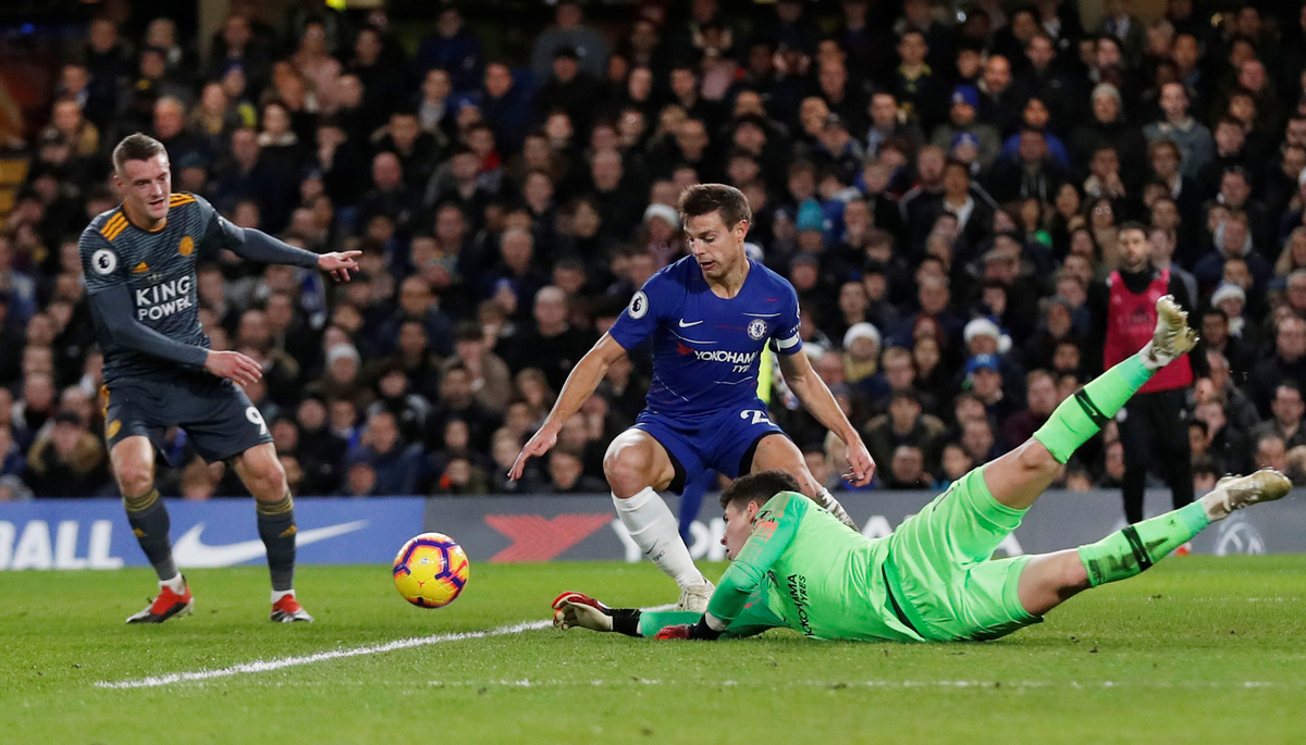 Hazard came close again but was denied by a brilliant Kasper Schmeichel save, while Cesar Azpilicueta's last-ditch block stopped Vardy adding another with a clever backheel.