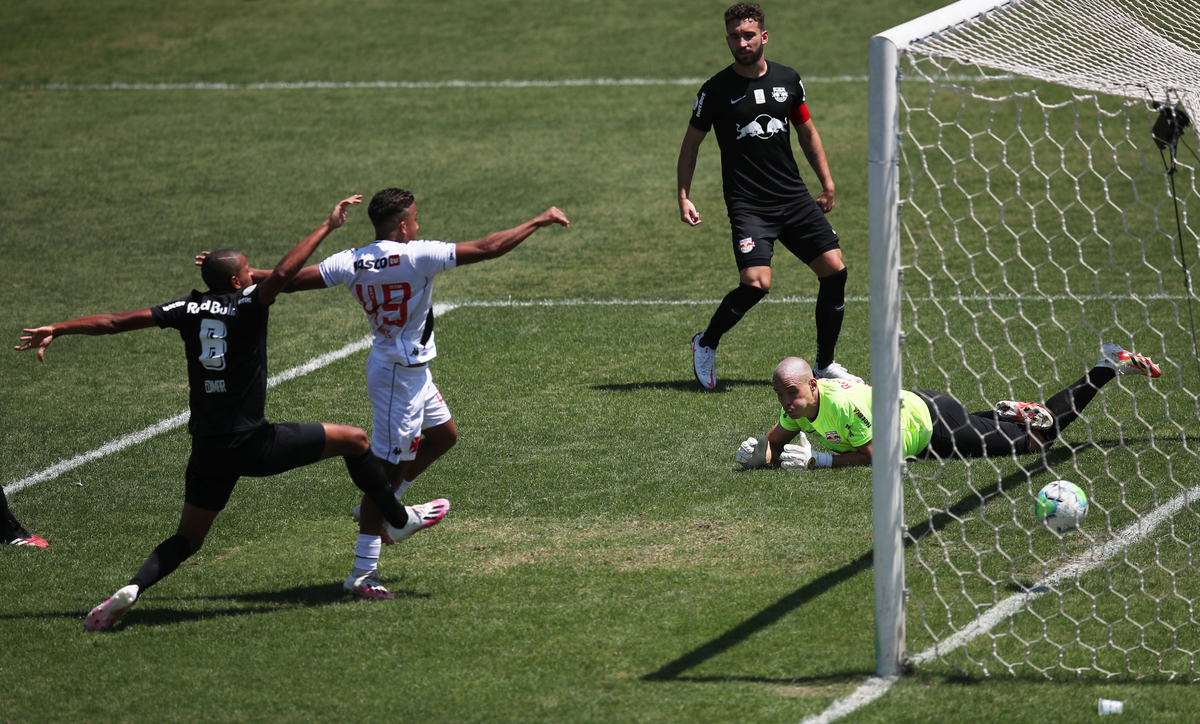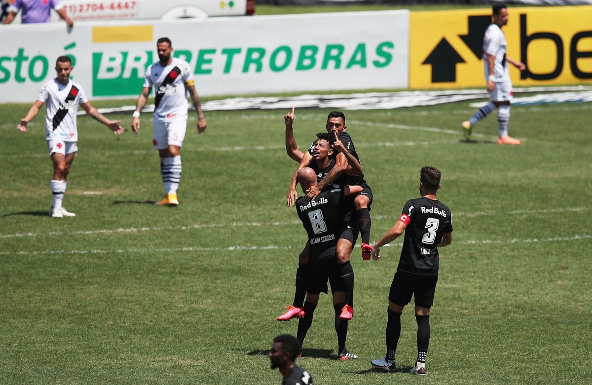 Soccer Football - Brasileiro Championship - Vasco da Gama v Red Bull Bragantino - Sao Januario stadium, Rio de Janeiro, Brazil - September 27, 2020. Red Bull Bragantino's Lucas Evangelista celebrates scoring their first goal with teammates. REUTERS/Ricardo MoraesSoccer Football - Brasileiro Championship - Vasco da Gama v Red Bull Bragantino - Sao Januario stadium, Rio de Janeiro, Brazil - September 27, 2020. Vasco da Gama's Vinicius Paiva scores their first goal. REUTERS/Ricardo MoraesSoccer Football - Brasileiro Championship - Vasco da Gama v Red Bull Bragantino - Sao Januario stadium, Rio de Janeiro, Brazil - September 27, 2020. Vasco da Gama's Fernando Miguel saves a penalty from Red Bull Bragantino's Alerrando REUTERS/Ricardo Moraes