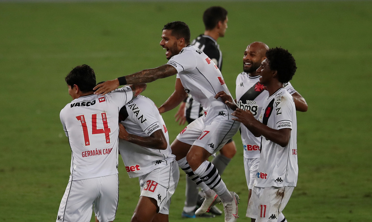 Soccer Football - Brasileiro Championship - Botafogo v Vasco da Gama - Nilton Santos Stadium, Rio de Janeiro, Brazil - September 13, 2020 Vasco da Gama's Ygor Catatau celebrates scoring their third goal with teammates REUTERS/Ricardo MoraesSoccer Football - Brasileiro Championship - Botafogo v Vasco da Gama - Nilton Santos Stadium, Rio de Janeiro, Brazil - September 13, 2020 Botafogo's Kanu in action with Vasco da Gama's Ribamar REUTERS/Ricardo Moraes