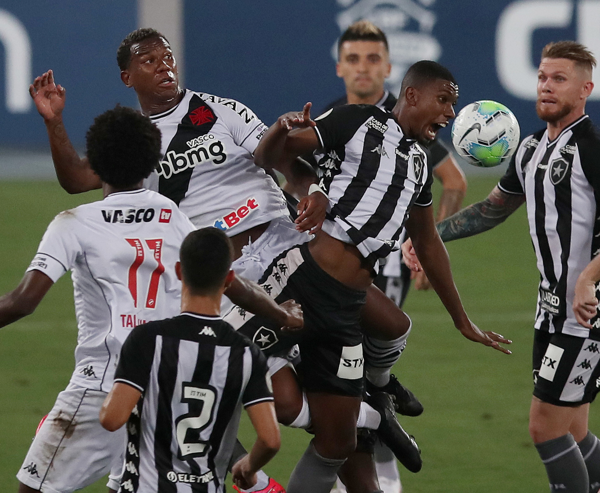 Soccer Football - Brasileiro Championship - Botafogo v Vasco da Gama - Nilton Santos Stadium, Rio de Janeiro, Brazil - September 13, 2020 Vasco da Gama's Leandro Castan in action with Botafogo's Luiz Otavio and Carlos Enrique Rentería REUTERS/Ricardo Moraes