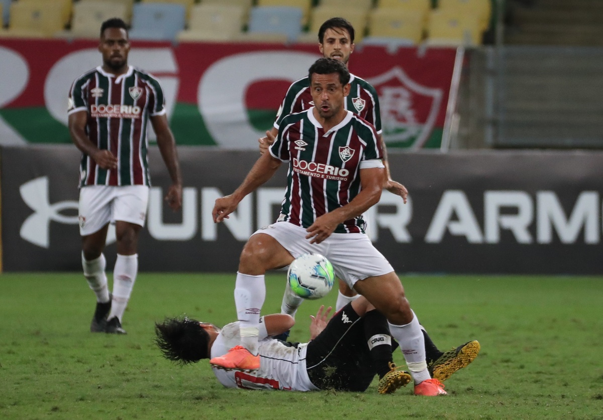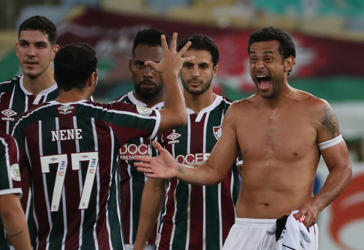 Soccer Football - Brasileiro Championship - Fluminense v Vasco da Gama - Maracana Stadium, Rio de Janeiro, Brazil - August 29, 2020 Fluminense's Marcos Paulo in action with Vasco da Gama's Yago Pikachu, following the resumption of play behind closed doors after the outbreak of the coronavirus disease (COVID-19) REUTERS/Sergio MoraesSoccer Football - Brasileiro Championship - Fluminense v Vasco da Gama - Maracana Stadium, Rio de Janeiro, Brazil - August 29, 2020 Fluminense's Fred in action with Vasco da Gama's Martin Benitez, following the resumption of play behind closed doors after the outbreak of the coronavirus disease (COVID-19) REUTERS/Sergio MoraesSoccer Football - Brasileiro Championship - Fluminense v Vasco da Gama - Maracana Stadium, Rio de Janeiro, Brazil - August 29, 2020 Fluminense's Dodi celebrates scoring their first goal with teammates, following the resumption of play behind closed doors after the outbreak of the coronavirus disease (COVID-19) REUTERS/Sergio Moraes