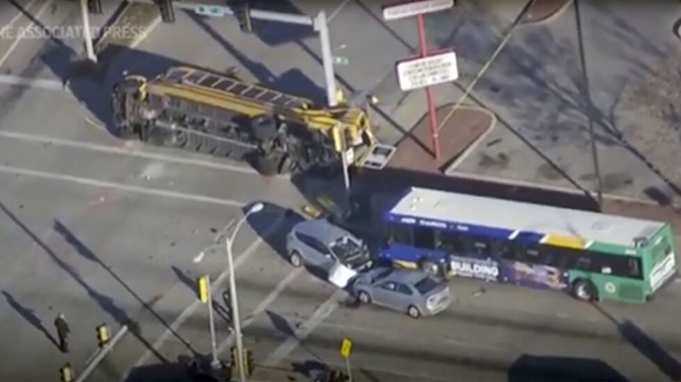 MILWAUKEE (AP) — A vehicle wanted in connection with a homicide in Chicago crashed into a school bus during a police chase in Milwaukee on Wednesday, sending multiple people to area hospitals.