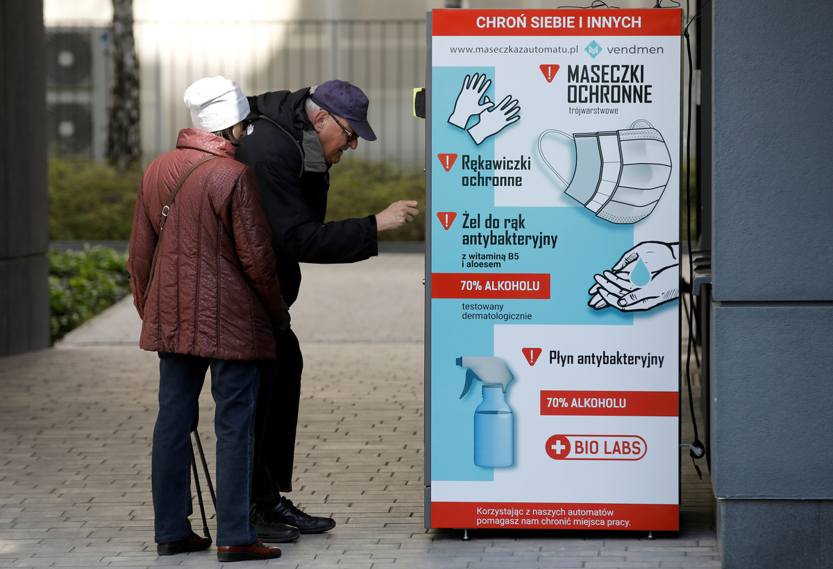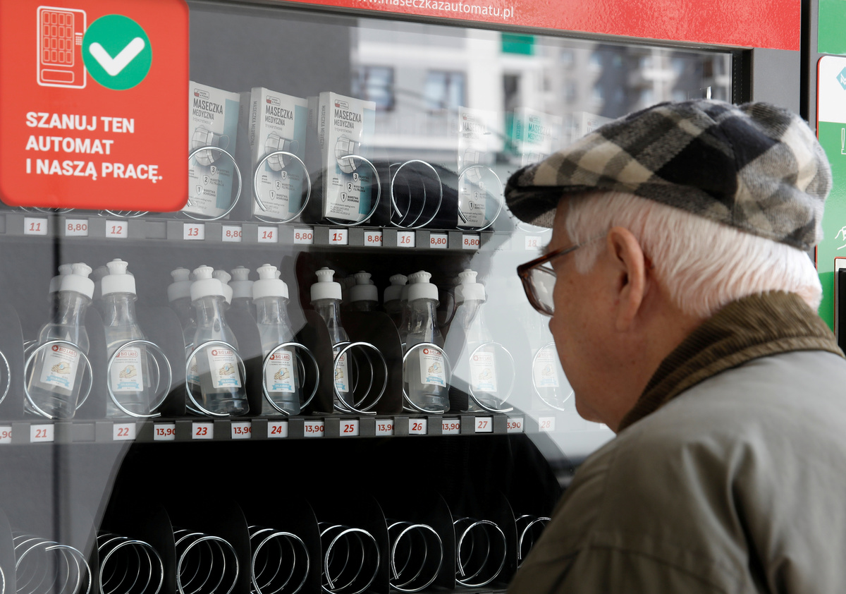 Vending machines selling face masks, gloves and sanitizers appeared on the streets of Poland's two biggest cities this week, as the country stepped up social distancing rules to curtail the spread of the coronavirus.