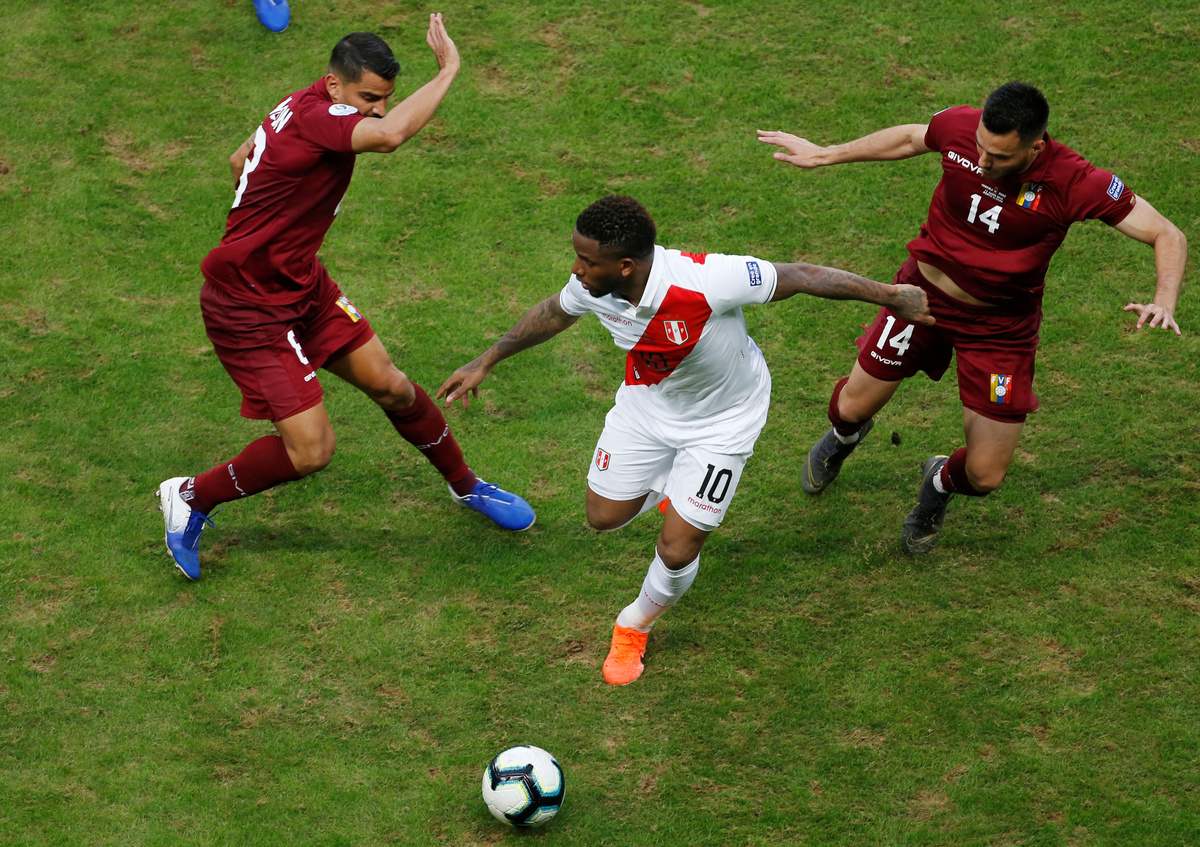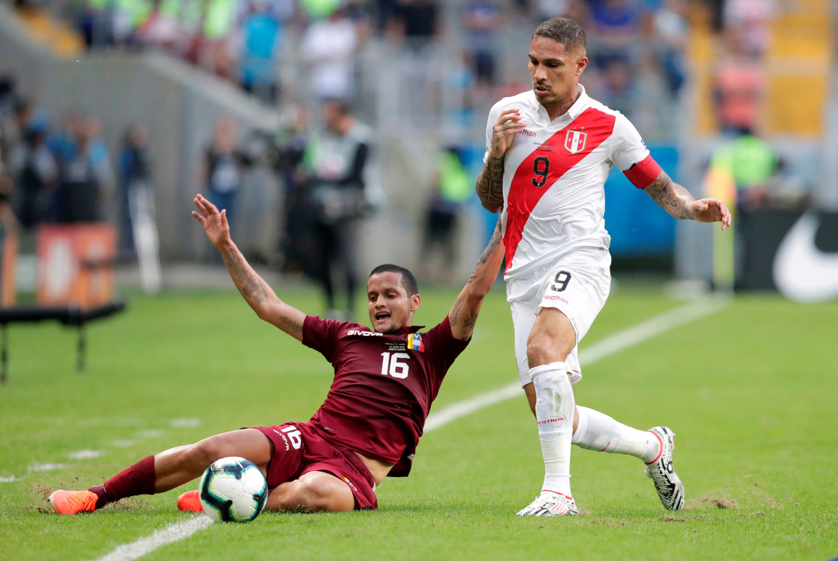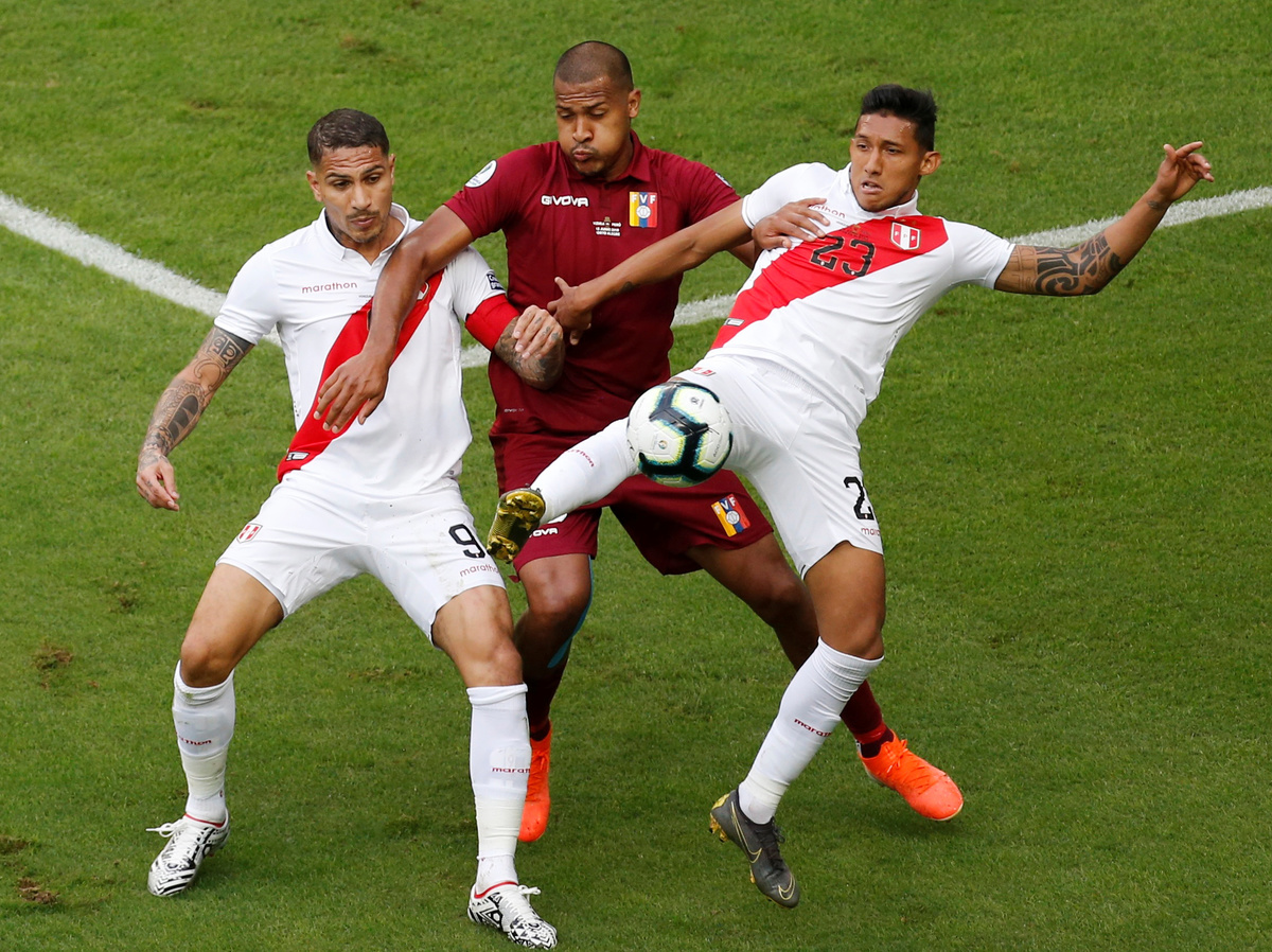 Soccer Football - Copa America Brazil 2019 - Group A - Venezuela v Peru - Arena Do Gremio, Porto Alegre, Brazil - June 15, 2019 Peru's Paolo Guerrero in action with Venezuela's Roberto Rosales REUTERS/Henry RomeroSoccer Football - Copa America Brazil 2019 - Group A - Venezuela v Peru - Arena Do Gremio, Porto Alegre, Brazil - June 15, 2019 Venezuela's John Chancellor in action with Peru's Paolo Guerrero and Carlos Zambrano REUTERS/Diego VaraSoccer Football - Copa America Brazil 2019 - Group A - Venezuela v Peru - Arena Do Gremio, Porto Alegre, Brazil - June 15, 2019 Venezuela's Salomon Rondon in action with Peru's Carlos Zambrano REUTERS/Henry Romero