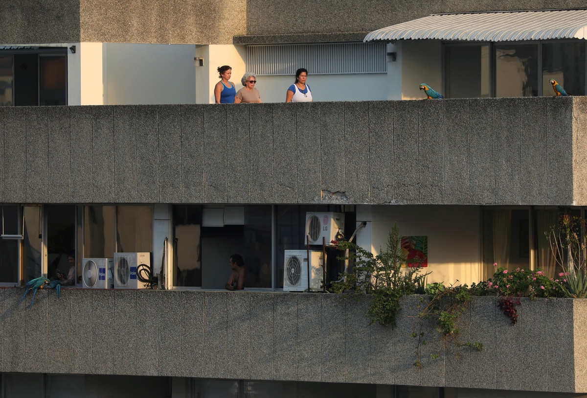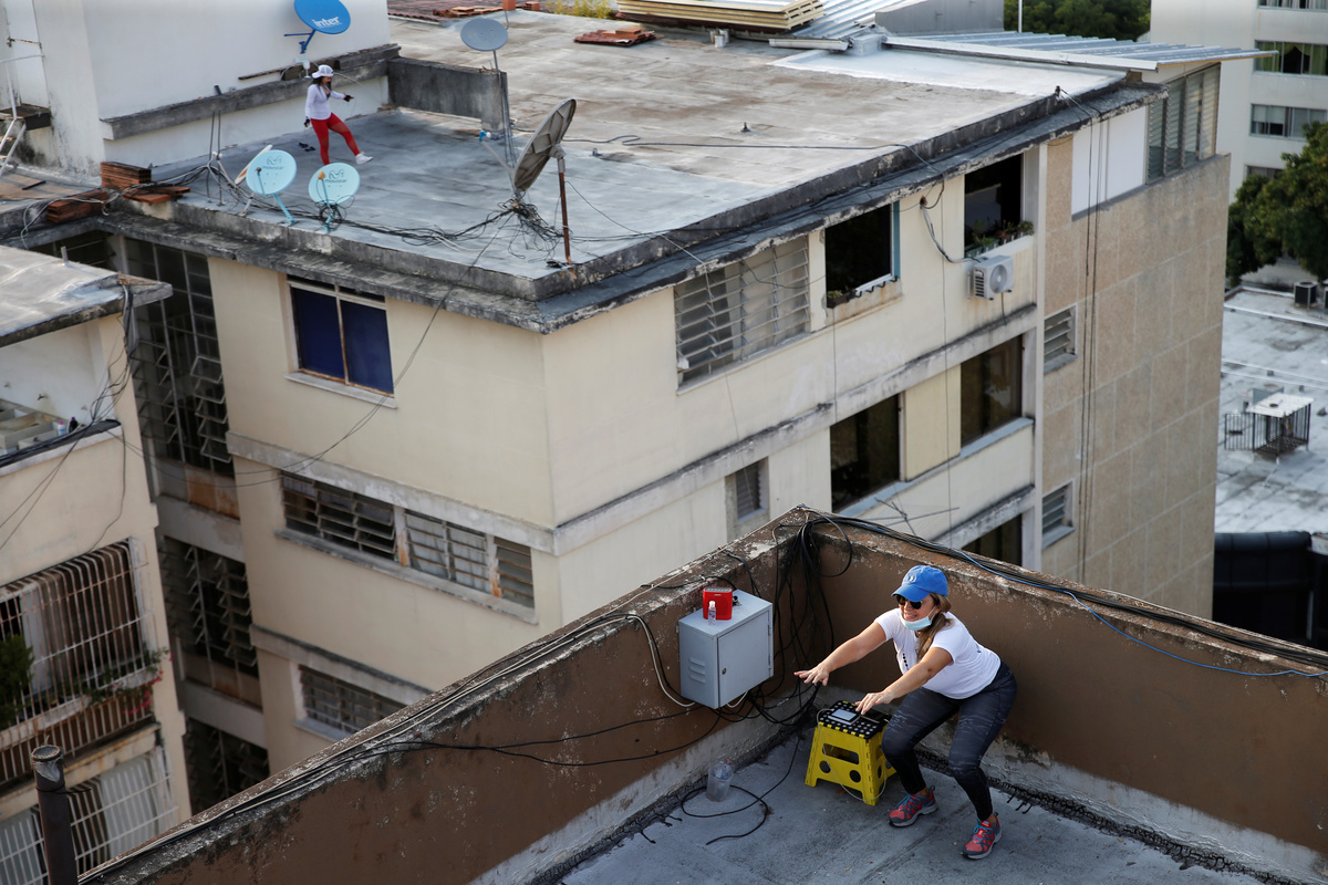People prepare to launch a plastic container filled with wine from one rooftop to another during a nationwide quarantine due to the coronavirus disease (COVID-19) outbreak in Caracas, Venezuela April 6, 2020. Picture taken April 6, 2020. REUTERS/Manaure QuinteroPeople walk near macaws at a rooftop during a nationwide quarantine due to the coronavirus disease (COVID-19) outbreak in Caracas, Venezuela April 6, 2020. Picture taken April 6, 2020. REUTERS/Manaure QuinteroNeighbors talk on the phone from different rooftops during a nationwide quarantine due to the coronavirus disease (COVID-19) outbreak in Caracas, Venezuela April 6, 2020. Picture taken April 6, 2020. REUTERS/Manaure QuinteroBerta Lopez feeds macaws at a rooftop during a nationwide quarantine due to the coronavirus disease (COVID-19) outbreak in Caracas, Venezuela April 6, 2020. Picture taken April 6, 2020. REUTERS/Manaure QuinteroFrancisco uses a fishing reel to throw wine in a plastic container from a rooftop during a nationwide quarantine due to the coronavirus disease (COVID-19) outbreak in Caracas, Venezuela April 6, 2020. Picture taken April 6, 2020. REUTERS/Manaure QuinteroNeighbors cheer from different rooftops during a nationwide quarantine due to the coronavirus disease (COVID-19) outbreak in Caracas, Venezuela April 7, 2020. Picture taken April 7, 2020. REUTERS/Manaure QuinteroBerta Lopez shares exercises routines with a neighbor on another rooftop during a nationwide quarantine due to the coronavirus disease (COVID-19) outbreak in Caracas, Venezuela April 7, 2020. Picture taken April 7, 2020. REUTERS/Manaure QuinteroFrancisco exercises at a rooftop during a nationwide quarantine due to the coronavirus disease (COVID-19) outbreak in Caracas, Venezuela April 7, 2020. Picture taken April 7, 2020. REUTERS/Manaure QuinteroA woman drinks at a rooftop during a nationwide quarantine due to the coronavirus disease (COVID-19) outbreak in Caracas, Venezuela April 6, 2020. Picture taken April 6, 2020. REUTERS/Manaure QuinteroA man throws a plastic container filled with wine to another rooftop during a nationwide quarantine due to the coronavirus disease (COVID-19) outbreak in Caracas, Venezuela April 6, 2020. Picture taken April 6, 2020. REUTERS/Manaure QuinteroPeople feed macaws from a window during a nationwide quarantine due to the coronavirus disease (COVID-19) outbreak in Caracas, Venezuela April 6, 2020. Picture taken April 6, 2020. REUTERS/Manaure Quintero