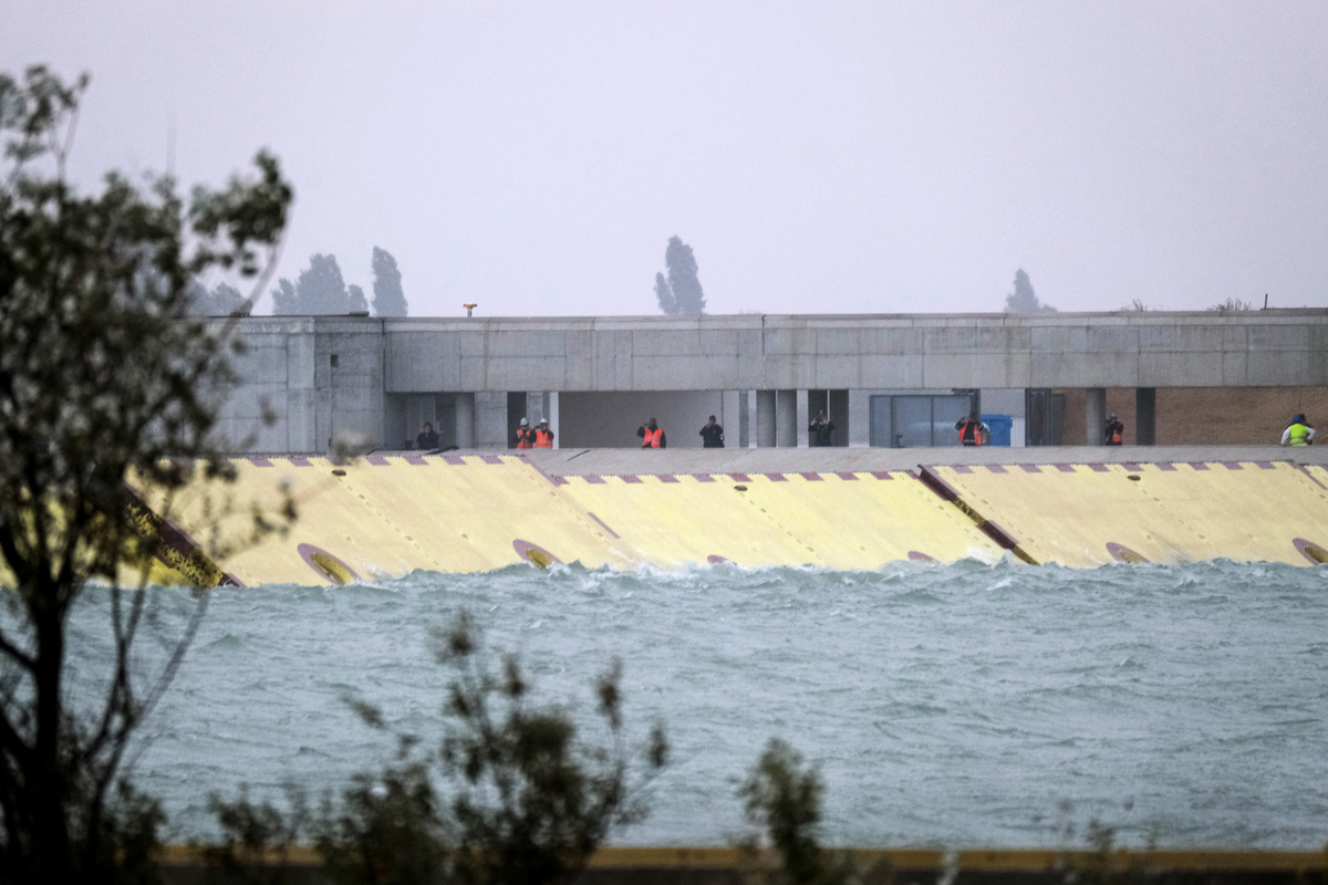 The network of 78 bright yellow barriers that guard the entrance to the delicate Venetian lagoon lifted from the sea bed as the tide, driven by strong winds and rain, started to climb.
