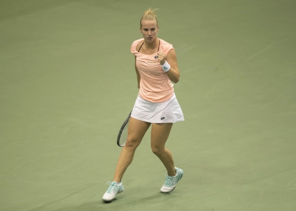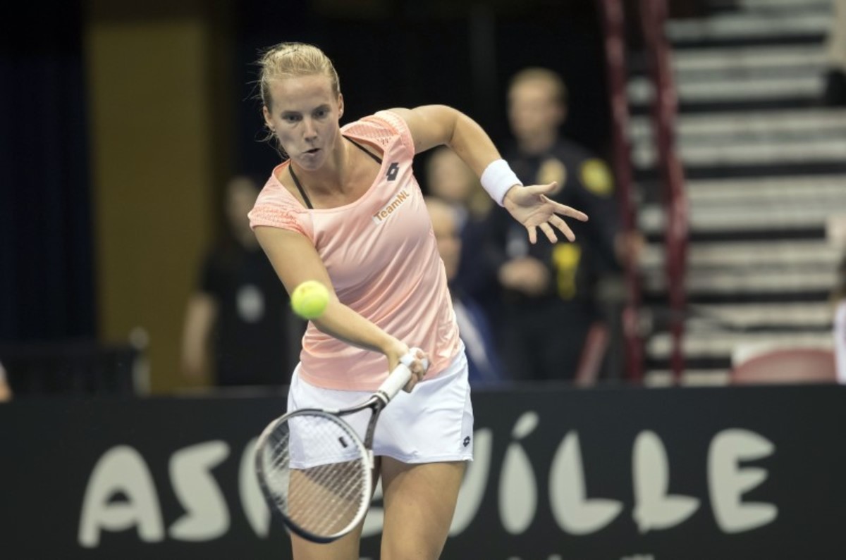 Feb 10, 2018; Asheville, NC, USA; Arantxa Rus (NED) in action during her match against Venus Williams (USA, not pictured) during the Fed Cup tie at U.S. Cellular Center. Susan Mullane-USA TODAY Sports
