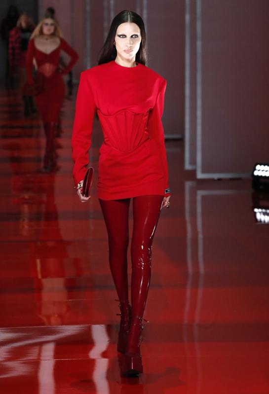 Presented on a glossy red lacquered runway, almost every single one of the 60 looks Versace unveiled this weekend featured on-show corsetry.