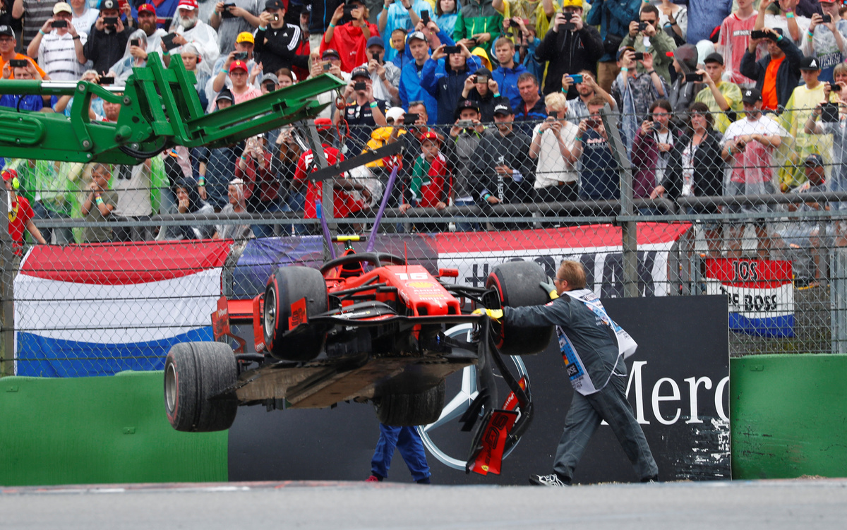 The stewards noted in their written decision that Leclerc drove out at an acute angle to avoid a tyre changer in the adjacent pit.