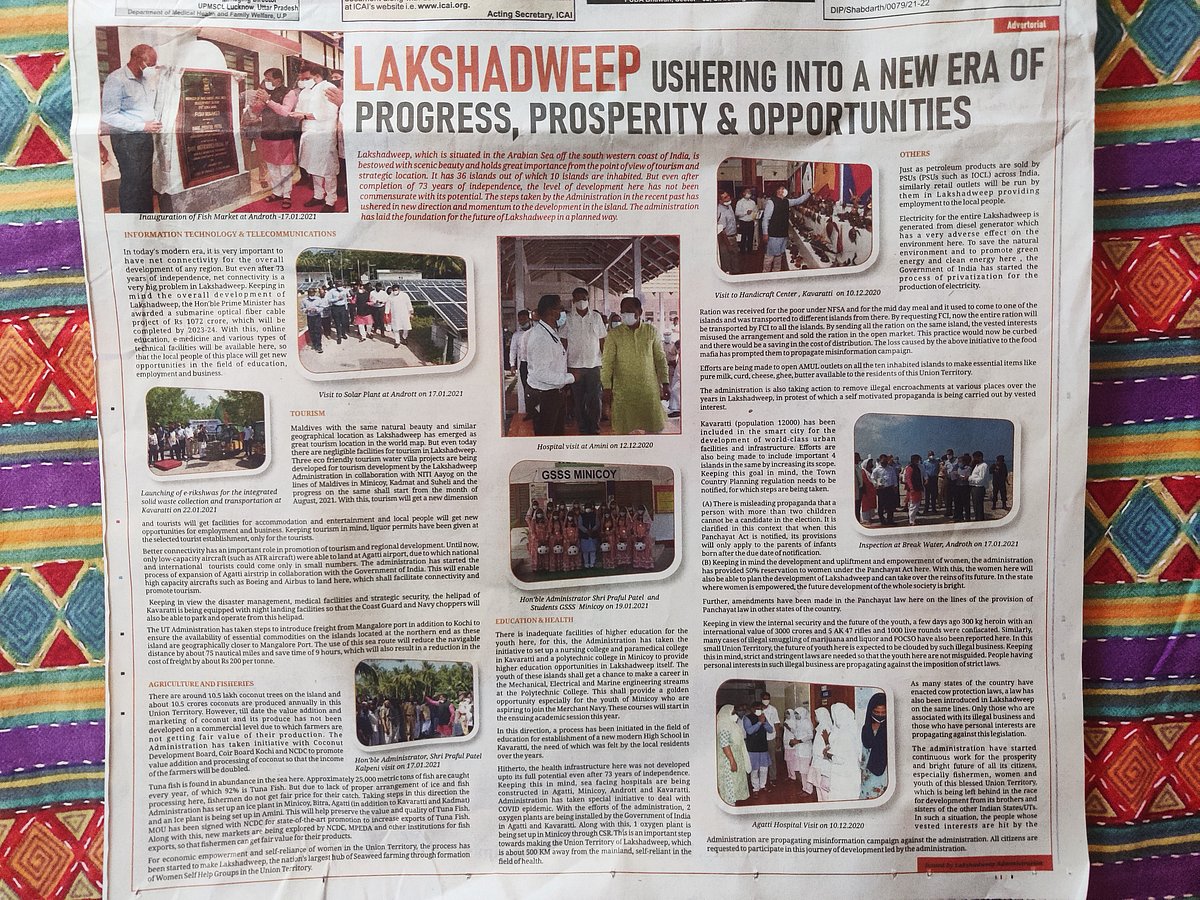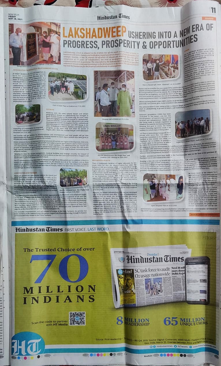 Even as Lakshadweep administrator Praful K Patel is being widely criticised for making sweeping changes in the union territory, the Lakshadweep administration issued large advertorials in national dailies like the Times of India, New Indian Express and Hindustan Times.